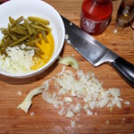 Dodaj korniszony posiekane w małe słupki (o wielkości zbliżonej do pokrojonych grzybów) oraz cebulę pokrojoną w bardzo drobną kostkę.
