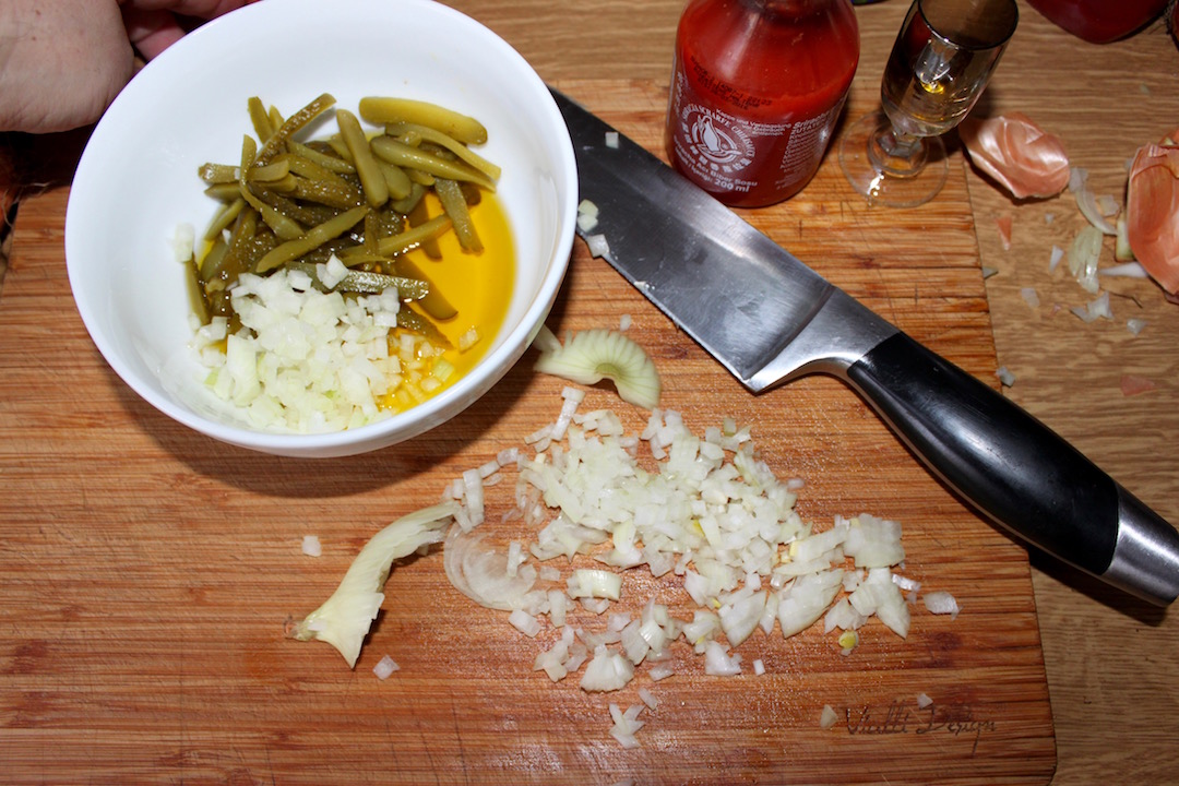 Dodaj korniszony posiekane w małe słupki (o wielkości zbliżonej do pokrojonych grzybów) oraz cebulę pokrojoną w bardzo drobną kostkę.