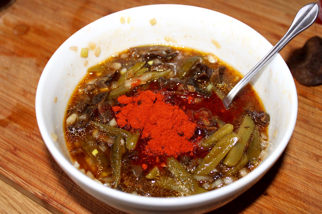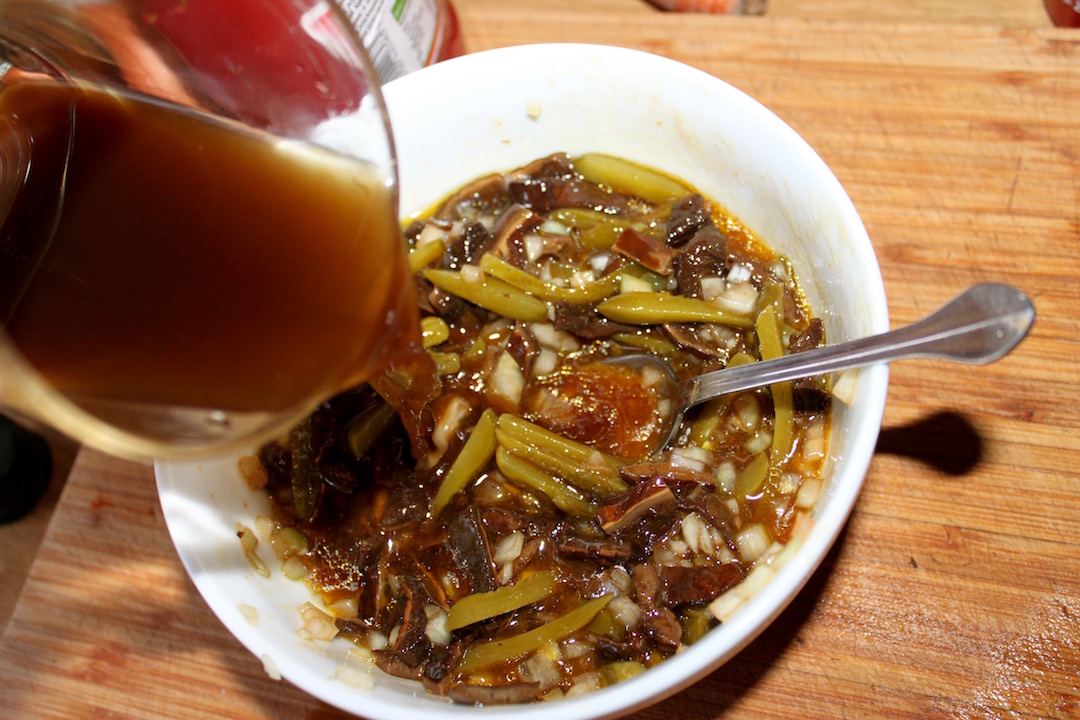 Do miski przełóż posiekane grzyby i wlej wywar z ich gotowania.