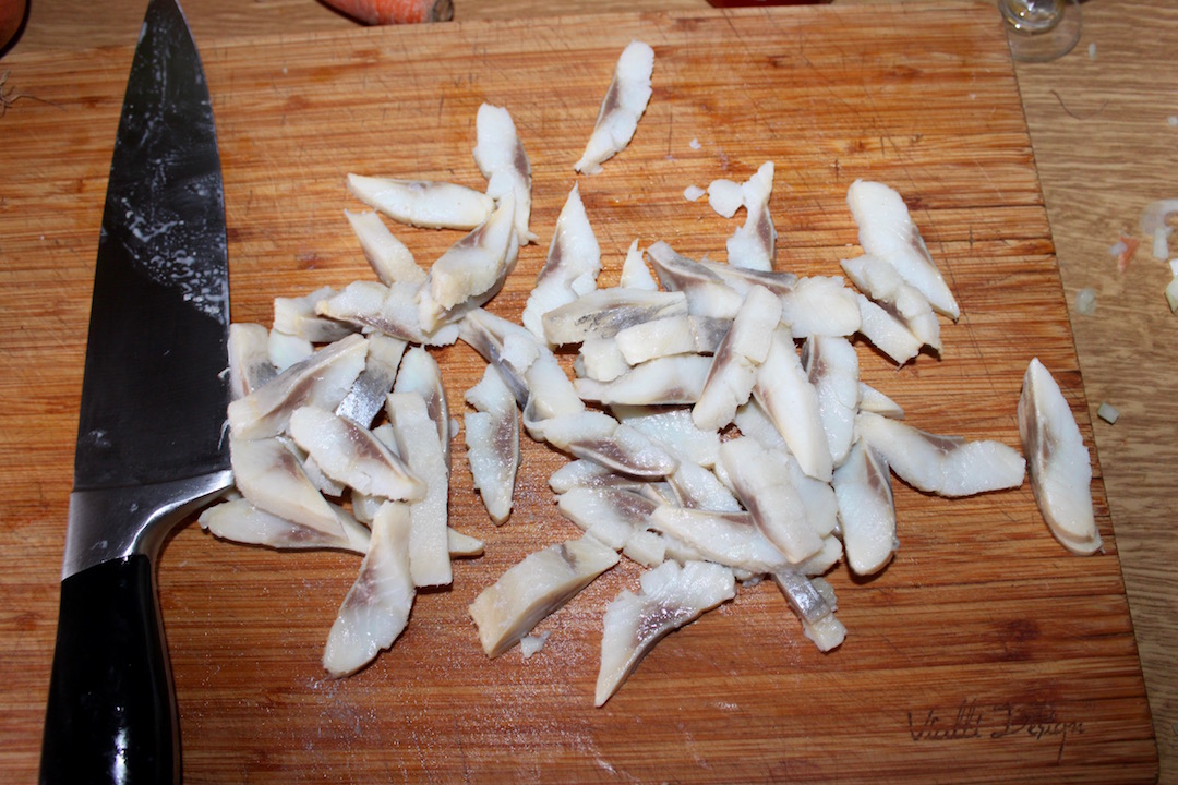 Wymoczone śledzie pokrój w cienkie paseczki.