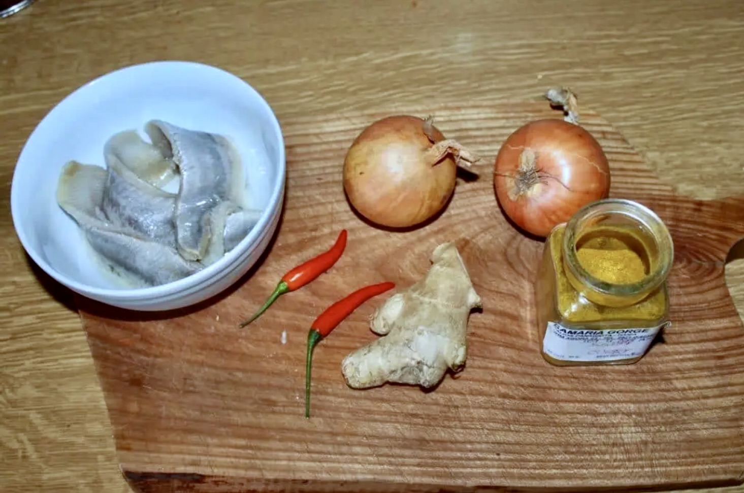 Przygotowanie dodatków: Pokrój papryczki chilli wraz z pestkami. Obierz i pokrój w piórka cebulę. Obierz imbir (potrzebujesz go startego).