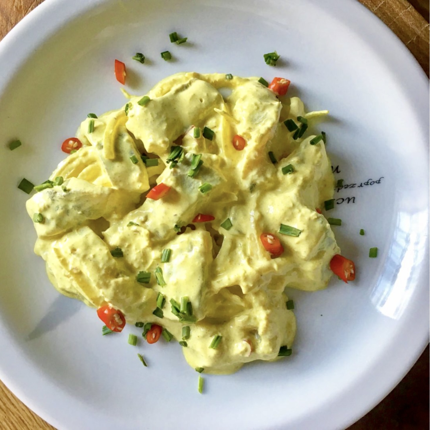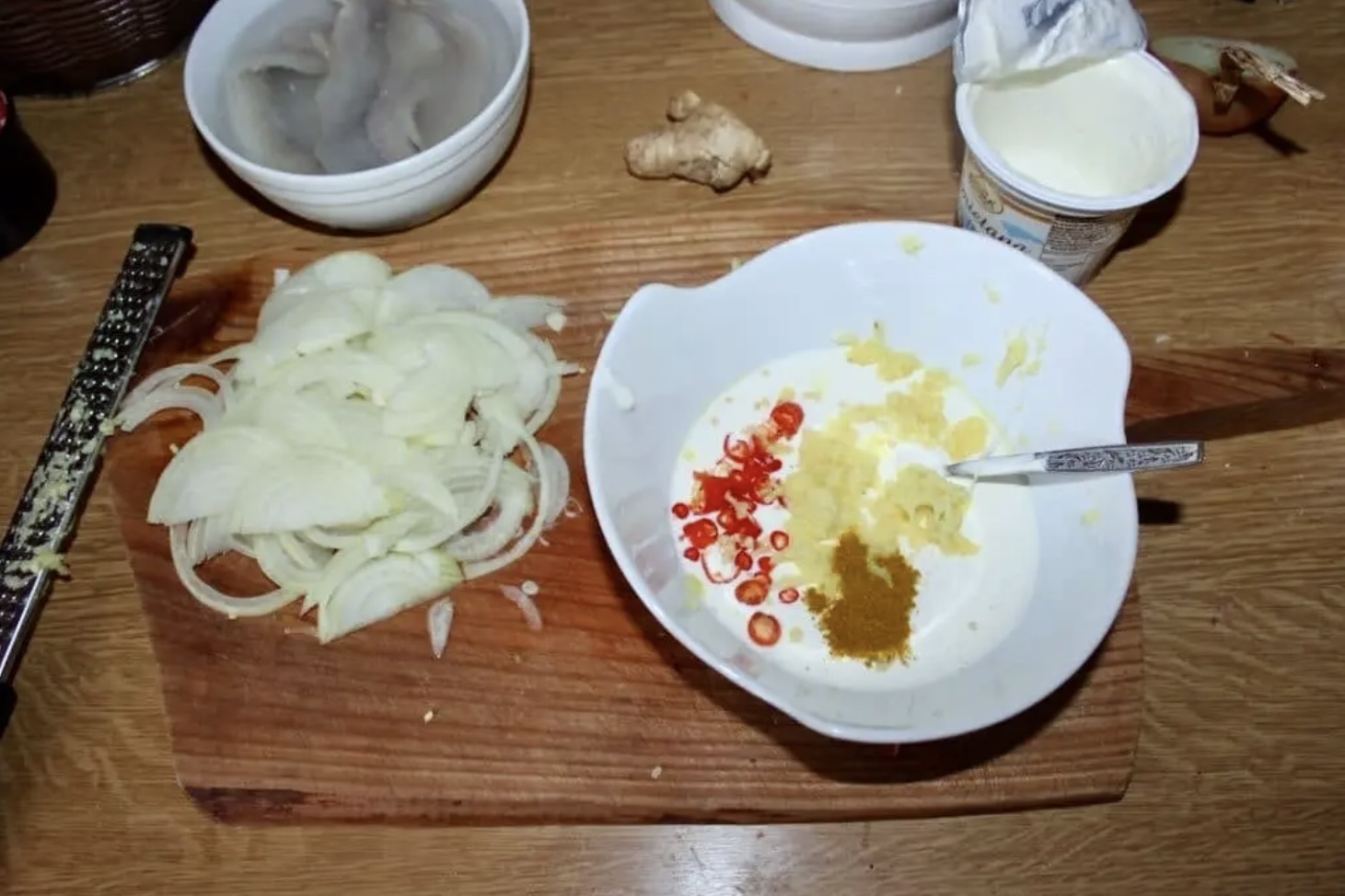 Przygotowanie śmietany: Przełóż śmietanę do miski. Dodaj posiekaną papryczkę chilli, 1 płaską łyżeczkę przyprawy curry oraz starty imbir.