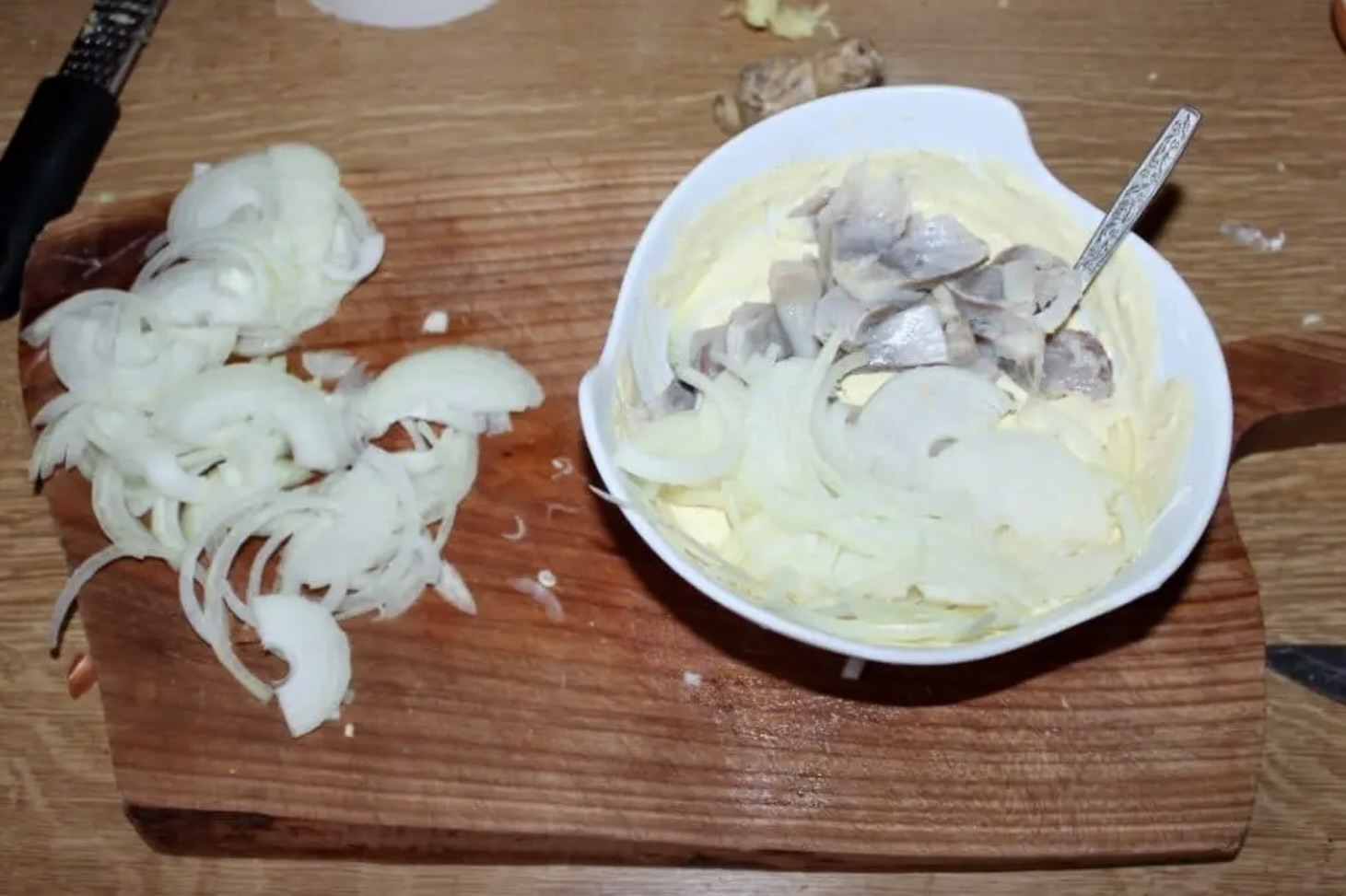 Przygotowanie śledzi: Śledzie wymocz w wodzie, aby uzyskały pożądaną słoność. Następnie pokrój je w niedużą kostkę.