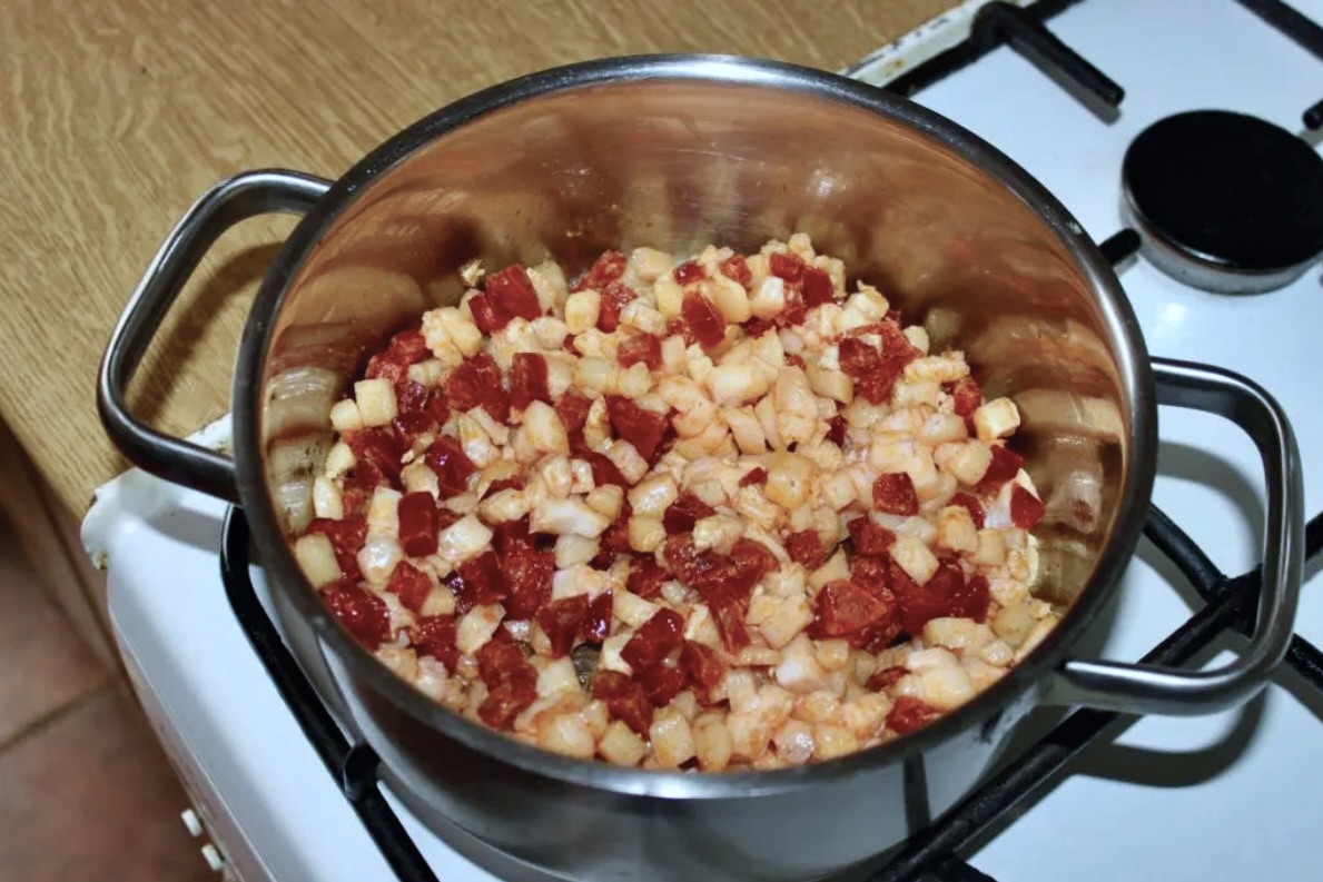 Do rondelka z wytapiającą się słoniną dodaj pokrojoną kiełbasę chorizo i posiekaną cebulę.