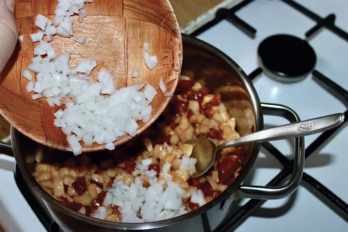 Dodanie kiełbasy i cebuli: