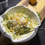 Łączenie składników: Do miski z awokado dodaj posiekane jajka oraz posiekaną dymkę. Ponownie skrop sokiem z cytryny, dopraw solą oraz pieprzem i delikatnie wymieszaj.