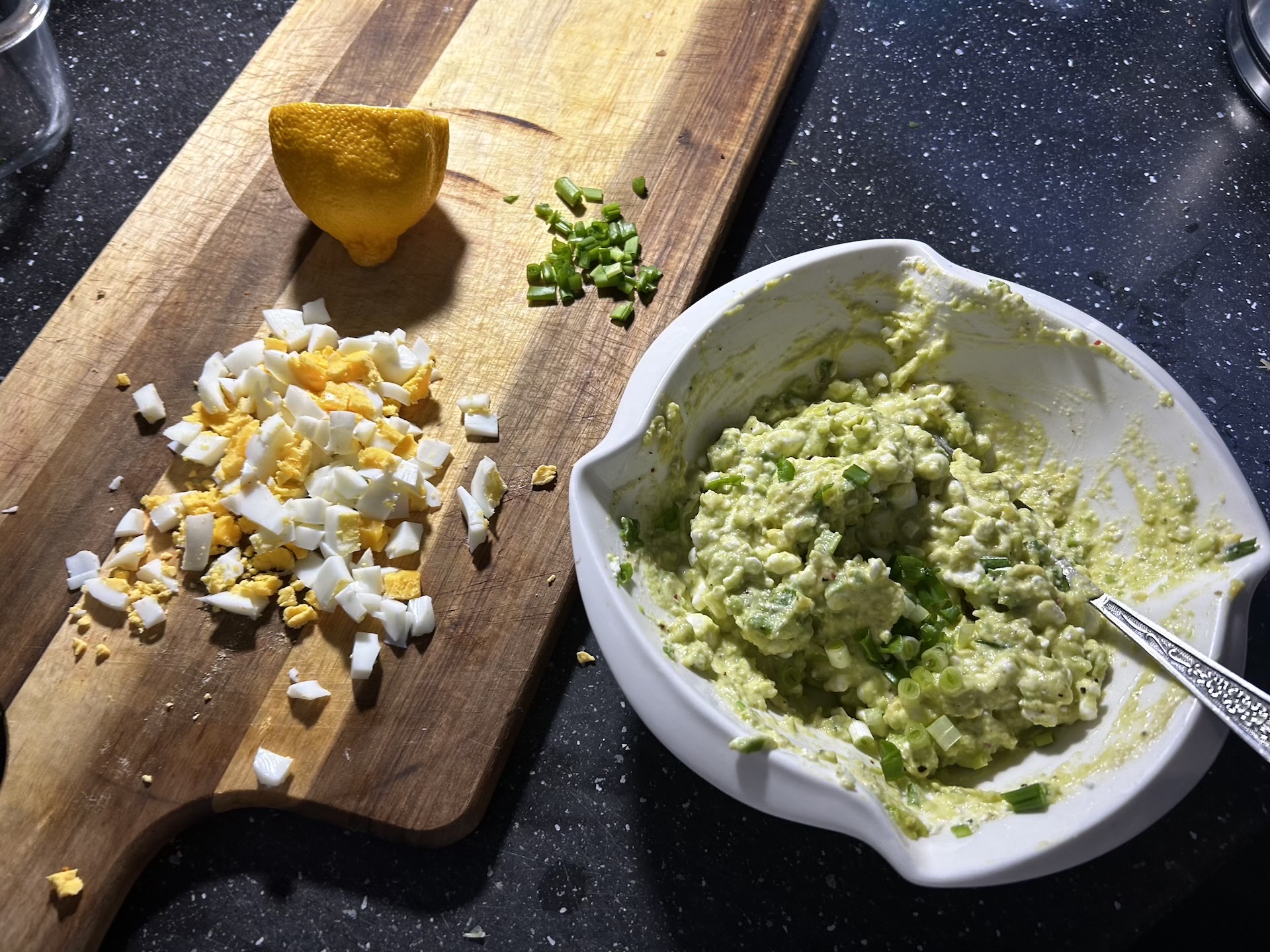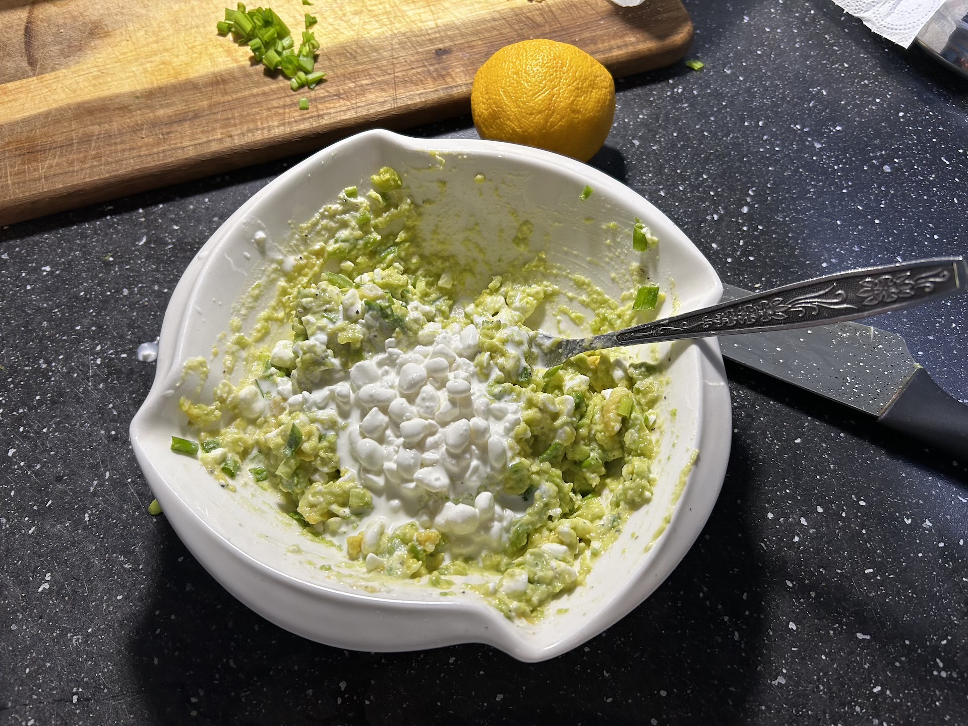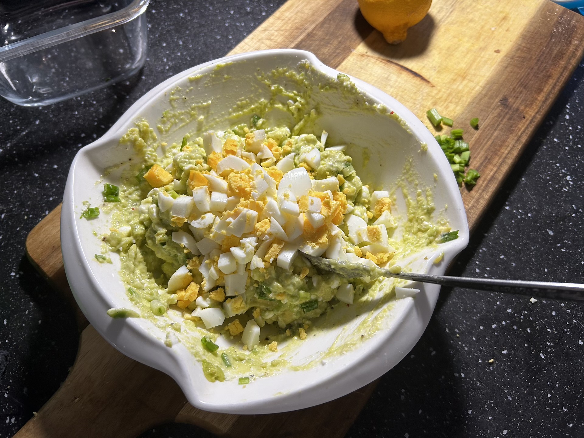 Łączenie składników: Do miski z awokado dodaj posiekane jajka oraz posiekaną dymkę. Ponownie skrop sokiem z cytryny, dopraw solą oraz pieprzem i delikatnie wymieszaj.
