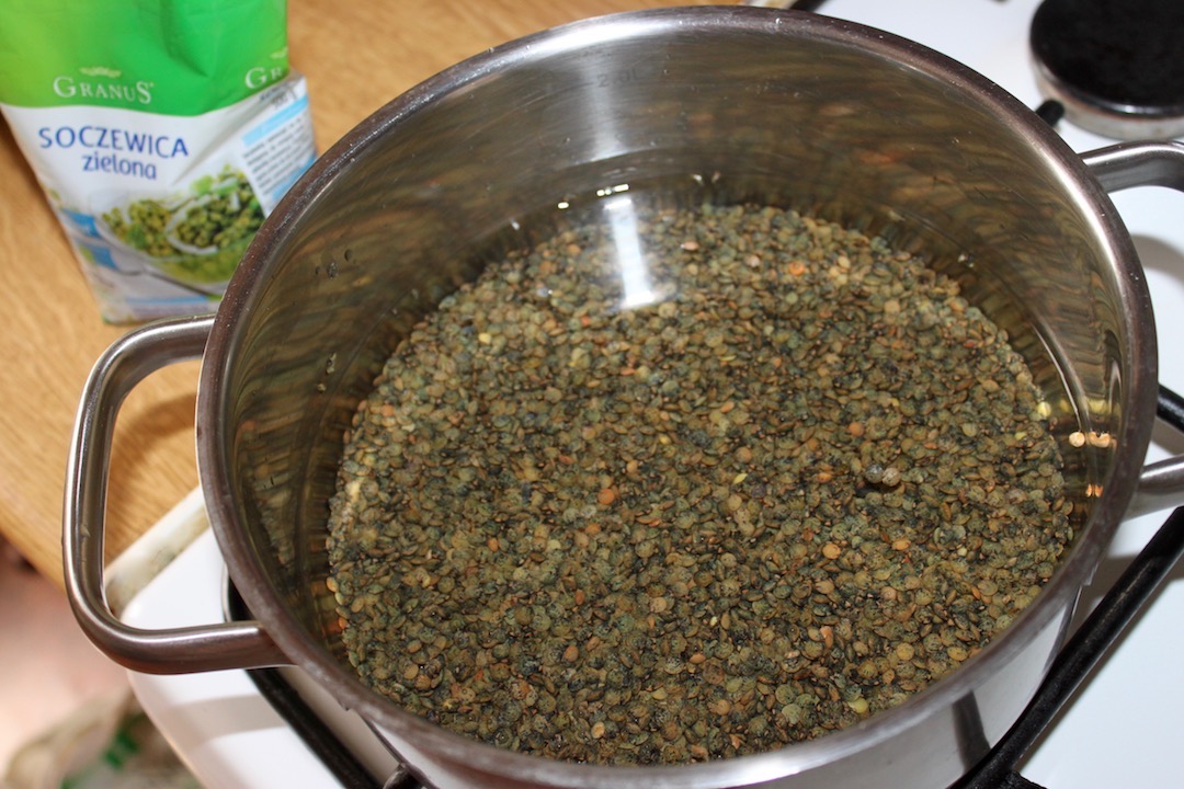 Przygotowanie soczewicy: Soczewicę namocz zgodnie z instrukcją na opakowaniu (zielona zwykle wymaga moczenia, brązowa zazwyczaj nie) lub dokładnie umyj pod bieżącą wodą.