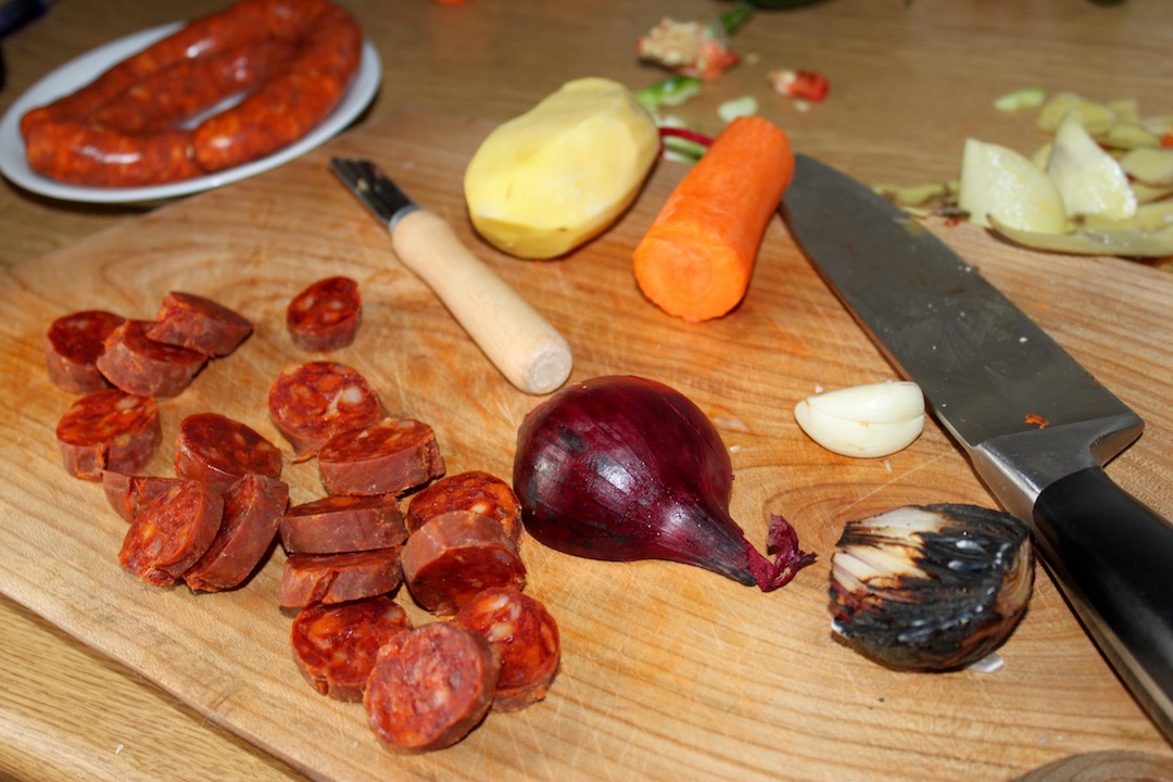 Przygotowanie warzyw: Świeże papryki przekrój wzdłuż na połówki i usuń nasiona. Marchewkę obierz. Cebulę opal nad ogniem (jak do rosołu). Chorizo pokrój w półcentymetrowej grubości plasterki.