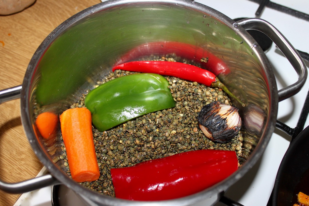 Wstępne gotowanie: Soczewicę umieść w garnku. Włóż do niego połówki świeżych papryk, papryczkę chilli w całości, całą marchewkę, a także opaloną cebulę.