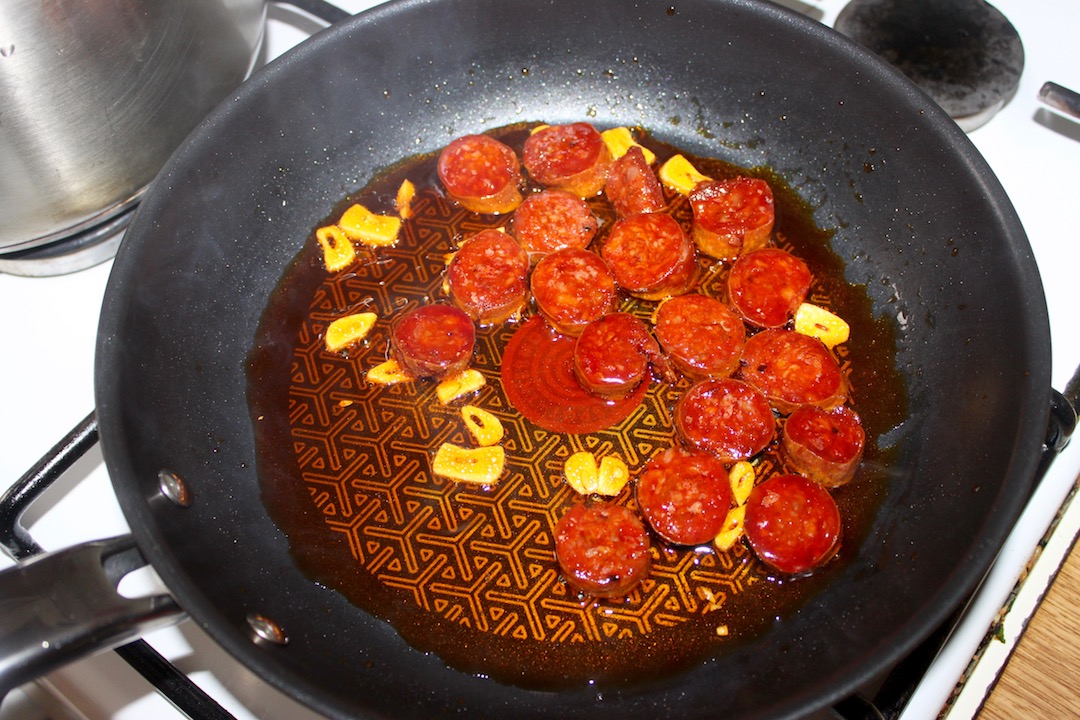 Smażenie chorizo: Na małej patelni usmaż (bez dodatkowego tłuszczu) kiełbasę chorizo, aż dobrze się wytopi i stanie lekko chrupiąca. Dodaj pokrojony w cienkie plasterki czosnek, a następnie smaż jeszcze 30 sekund.