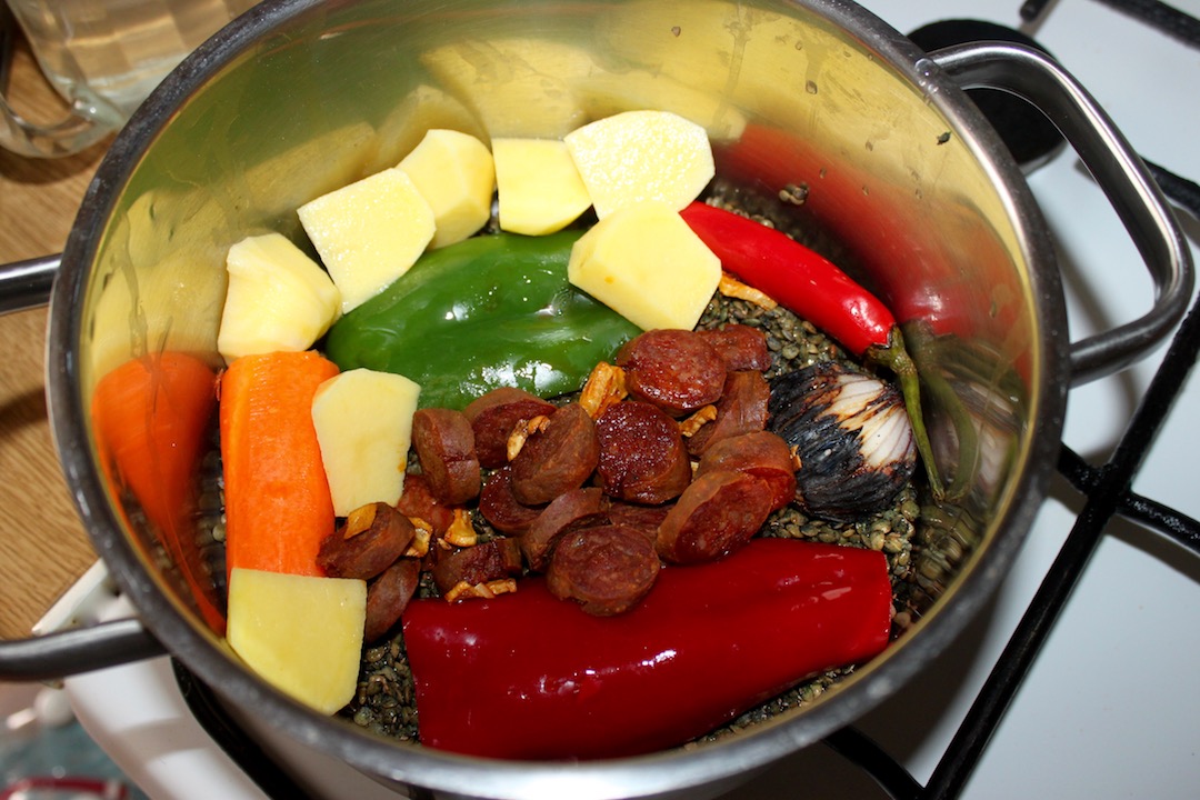 Łączenie składników: Przesmażone chorizo z czosnkiem i wytopionym tłuszczem przelej do garnka z soczewicą i warzywami. Dodaj pokrojone w kostkę ziemniaki. Na koniec włóż surowe, paprykowane kiełbaski lub kawałek wędzonki.