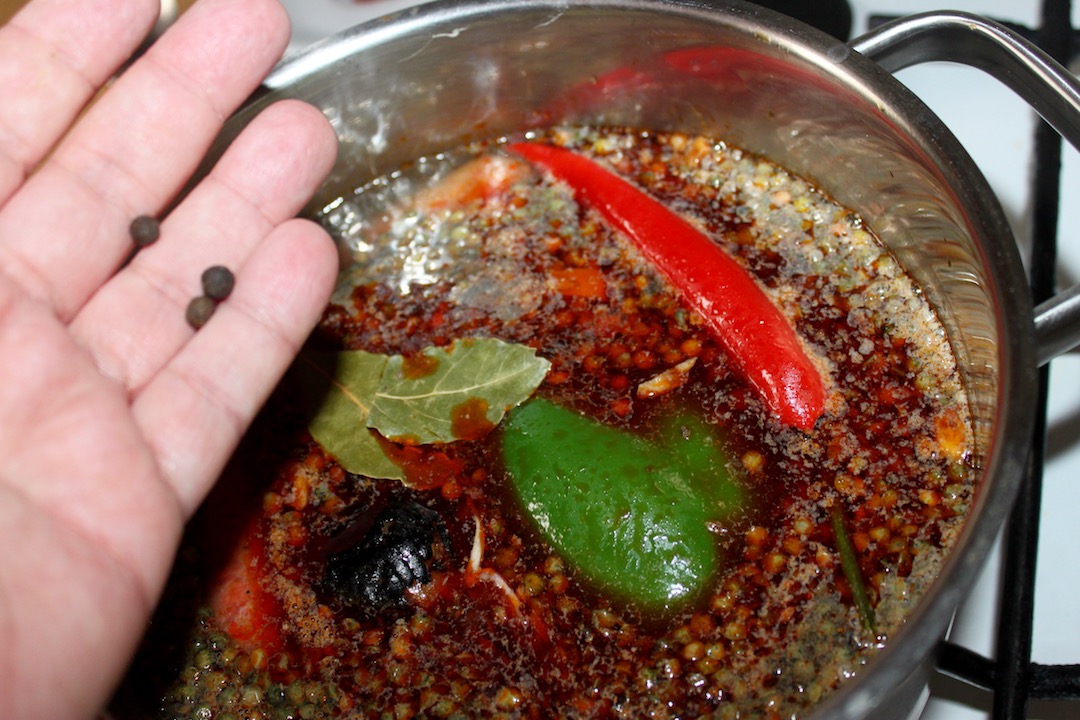 Gotowanie: Zalej wszystko 1 litrem wody. Doprowadź do wrzenia i dodaj listki laurowe oraz ziele angielskie. Dodaj również 1 płaską łyżkę przecieru pomidorowego (możesz go wcześniej lekko przesmażyć).