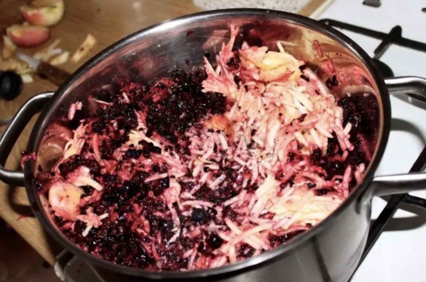 Dodanie jabłek: Jabłka podziel na ćwiartki, wypestkuj, również zmiksuj w malakserze i dodaj do aronii w garnku.