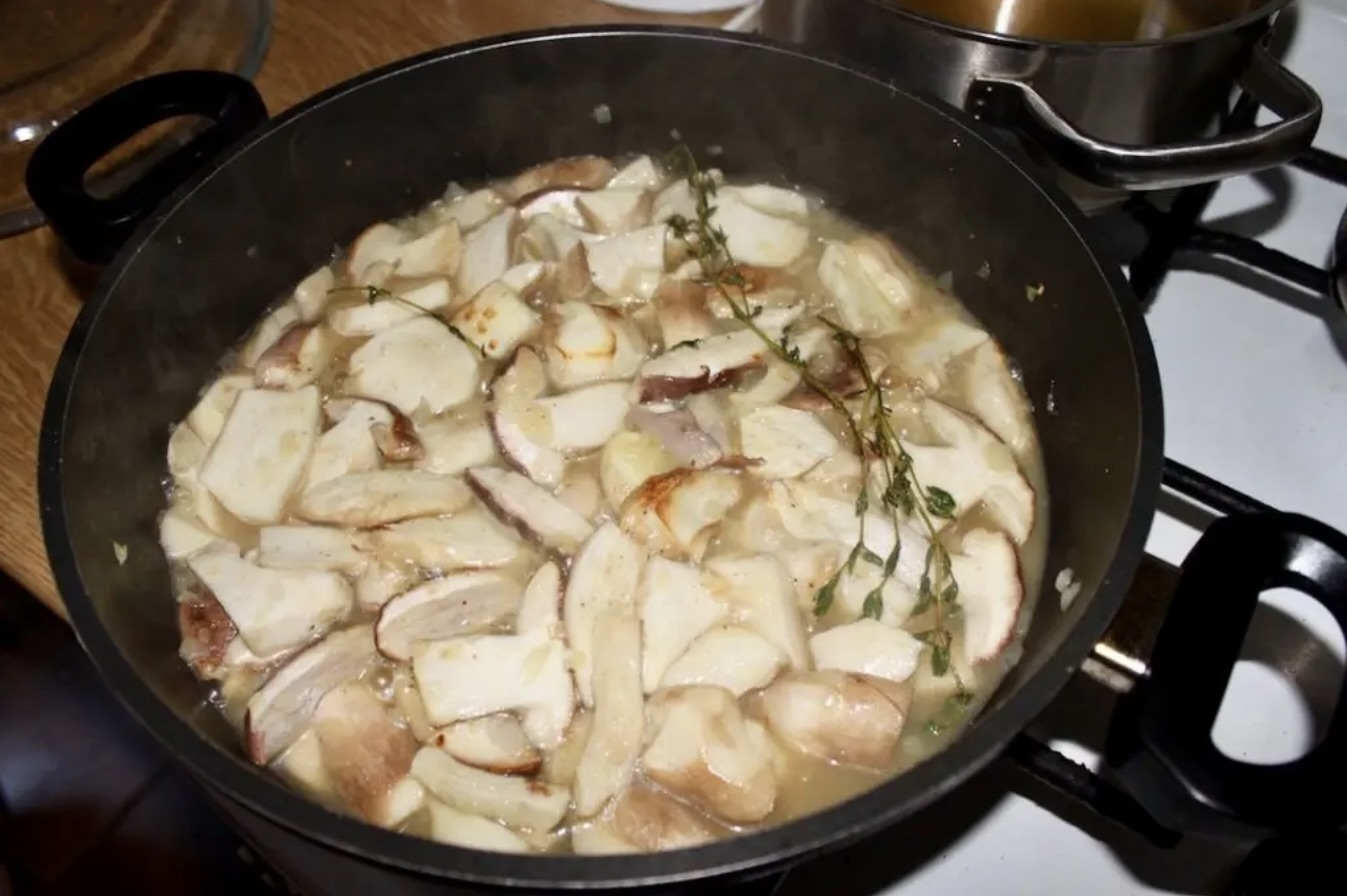 Duszenie: Wlej około 500 ml wywaru jarzynowego (lub grzybowego). Zamieszaj delikatnie, przykryj naczynie pokrywką, zmniejsz gaz do minimum i duś grzyby około 30 minut, aż staną się jędrne i miękkie. W trakcie duszenia podlewaj grzyby pozostałym wywarem, jeśli zajdzie taka potrzeba.