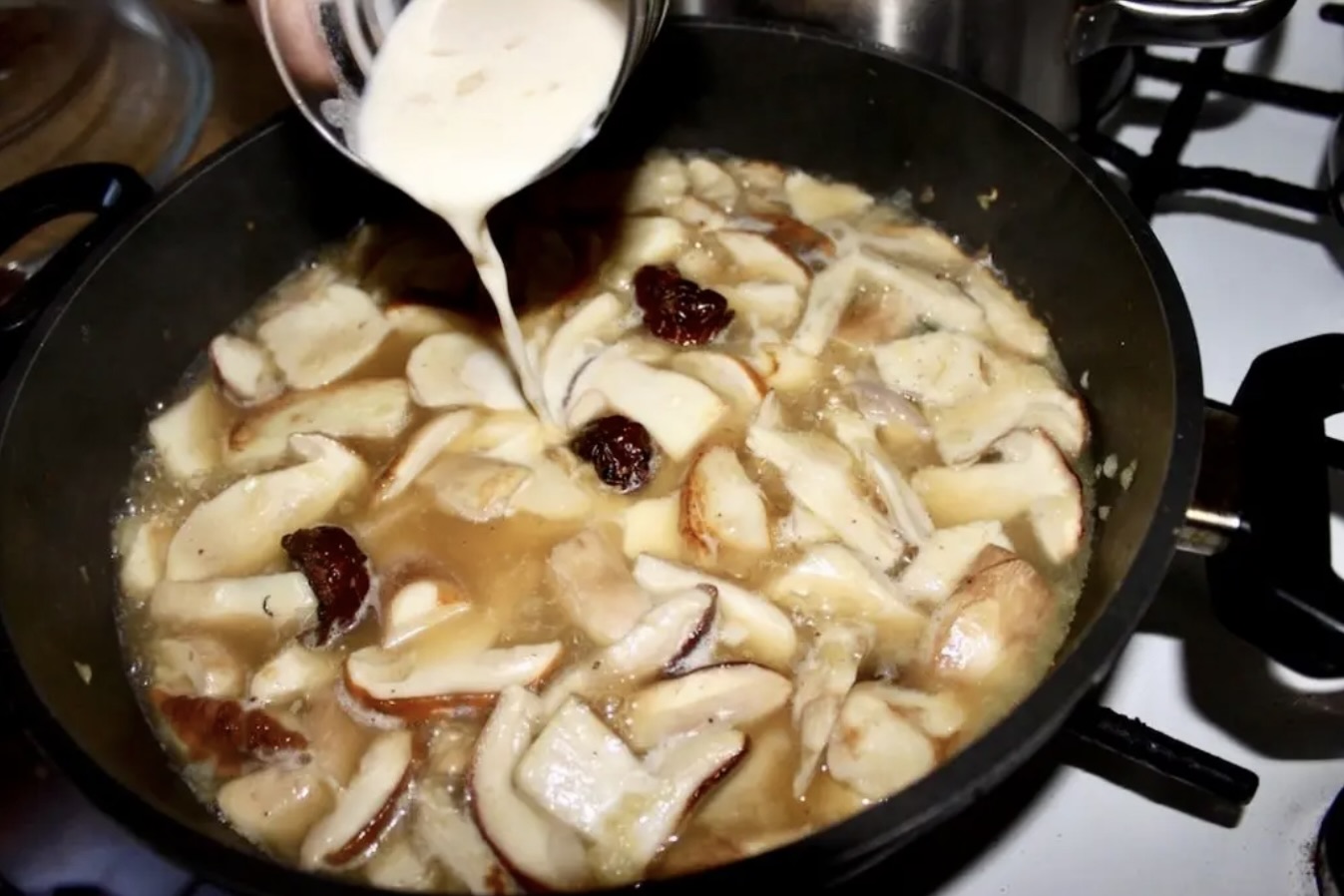 Zagęszczanie sosu: Gdy grzyby są miękkie, a ilość płynu odpowiada oczekiwanej gęstości sosu, dopraw go solą i pieprzem.