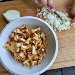 Smażenie bazy: Cebulę pokrój w drobną kostkę. Na patelni rozgrzej łyżkę masła z odrobiną oliwy. Podsmaż cebulę, aż lekko się zeszkli.