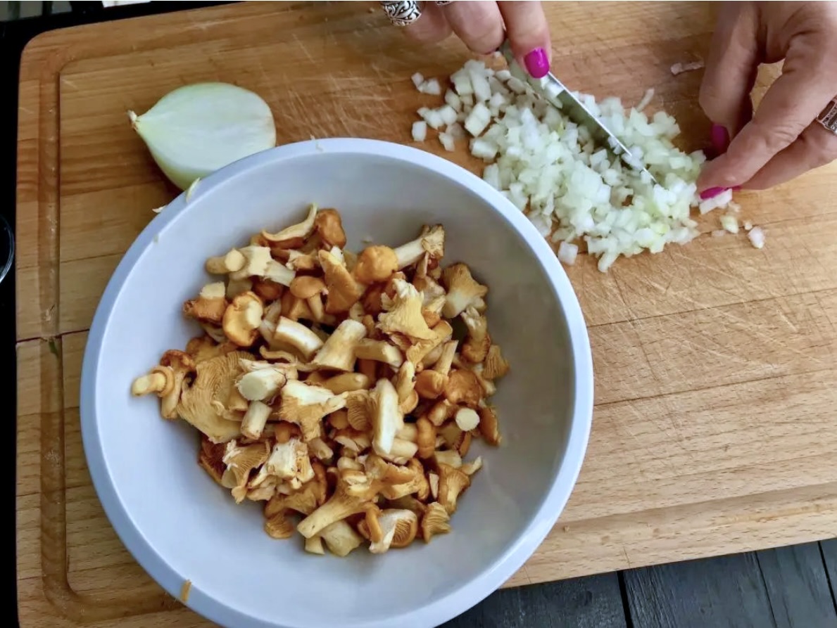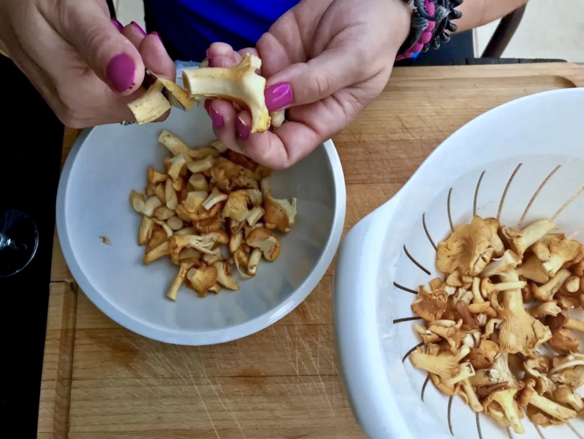 Oczyszczanie kurek: Grzybów nie należy długo moczyć. Przepłucz je szybko (2-3 sekundy) na durszlaku pod bieżącą wodą, otrzep i osusz na ręczniku papierowym. Większe sztuki pokrój na mniejsze kawałki, mniejsze zostaw w całości.