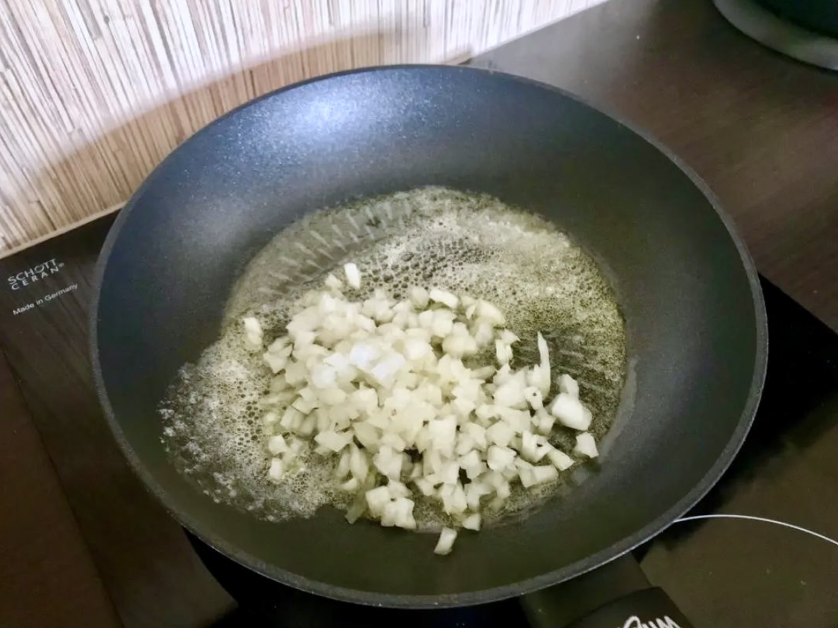 Smażenie bazy: Cebulę pokrój w drobną kostkę. Na patelni rozgrzej łyżkę masła z odrobiną oliwy. Podsmaż cebulę, aż lekko się zeszkli.