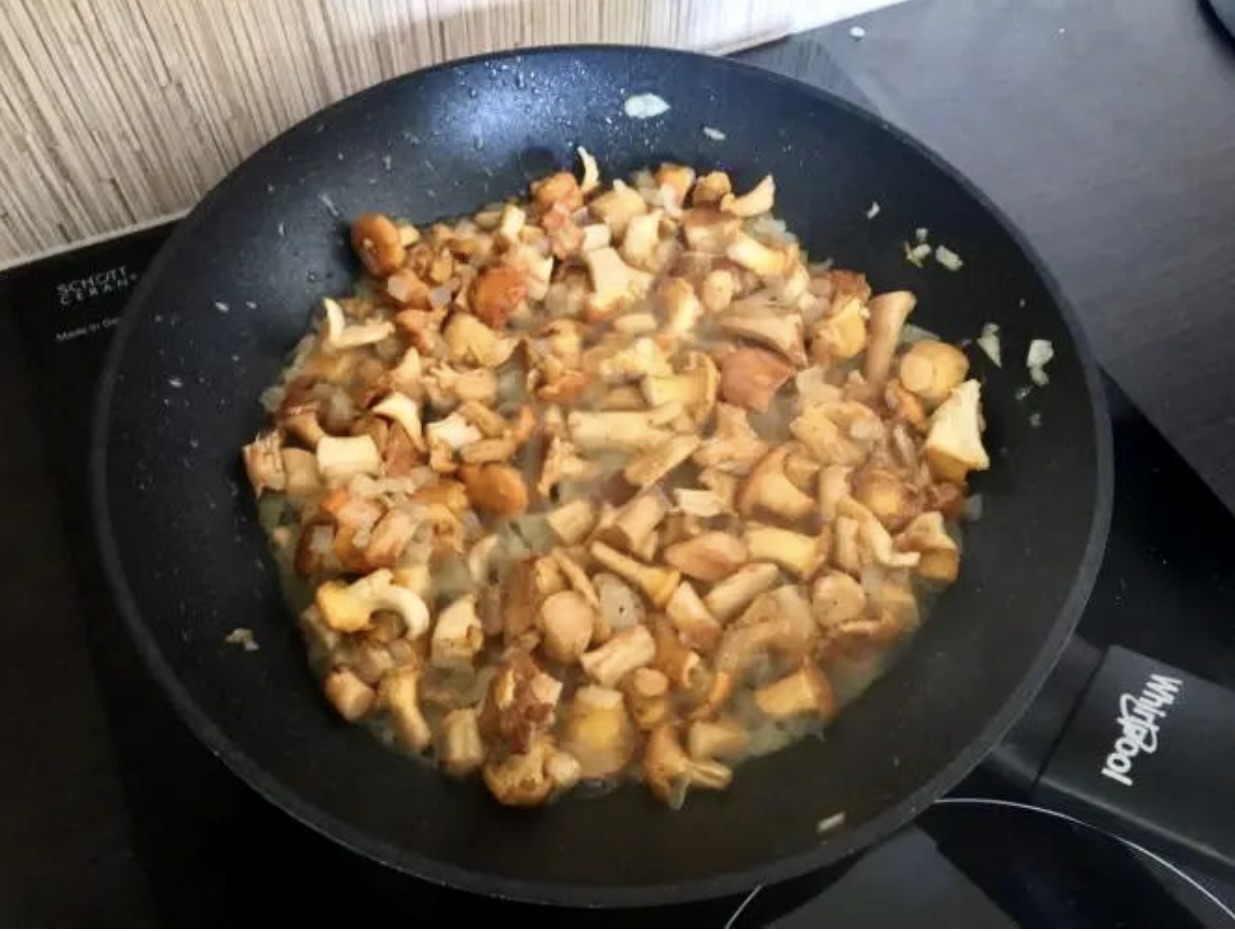Smażenie grzybów: Zwiększ ogień pod patelnią, wrzuć kurki i smaż je przez około 2–3 minuty.