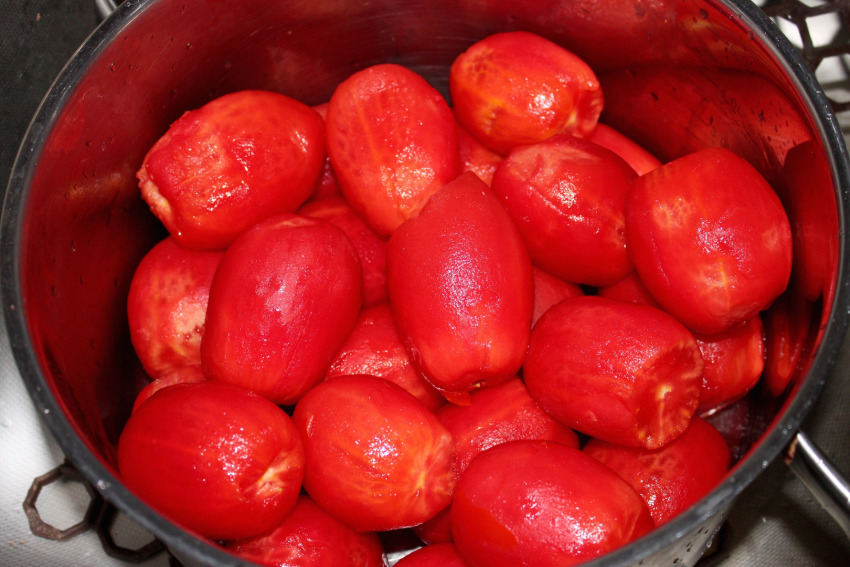 Przygotowanie pomidorów: Pomidory ponacinaj lekko na obu końcach. Włóż je do garnka, zalej wrzątkiem, a po minucie przelej zimną wodą. Następnie zdejmij z nich skórkę.