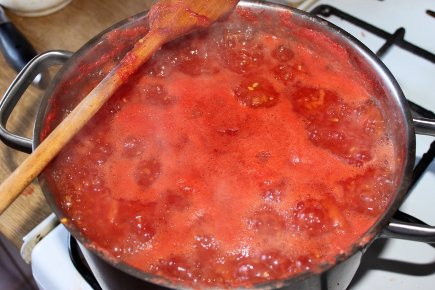 Gotowanie pomidorów: Pomidory zmiksuj w malakserze (lub zetrzyj na ręcznej tarce), przełóż do dużego garnka i gotuj na średnim ogniu 30-45 minut od momentu zagotowania, aż woda z pomidorów w dużej części odparuje.