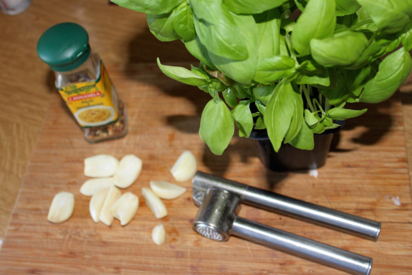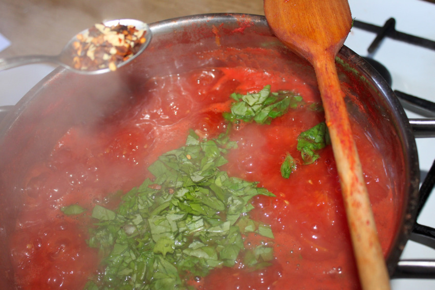 Dodanie przypraw: Podczas gdy pomidory się gotują, obierz i zmiażdż czosnek, a listki bazylii posiekaj. Dodaj czosnek, bazylię, łyżeczkę suszonego ostrego chili (lub peperoncino), łyżeczkę soli oraz łyżeczkę mielonego pieprzu do sosu. Jeśli sos jest zbyt kwaśny, dodaj również łyżeczkę cukru.