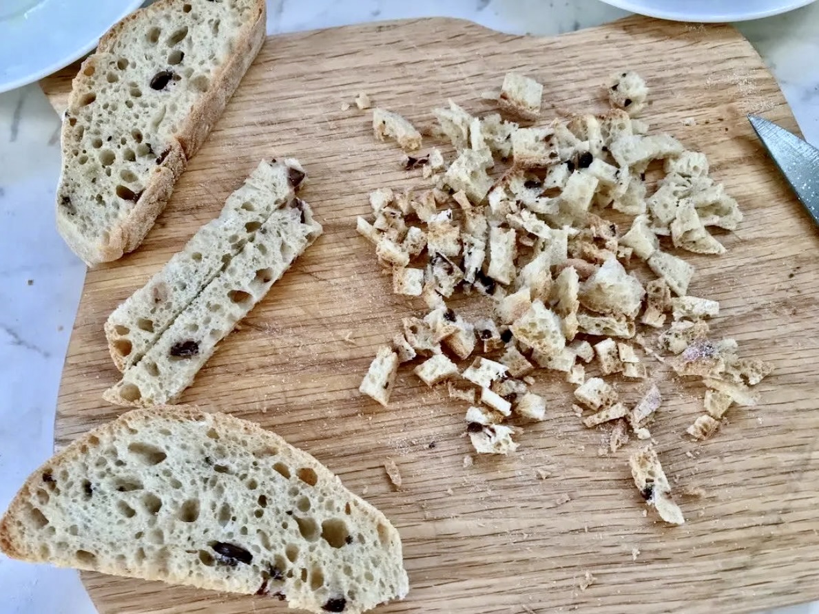 Chleb pokrój drobno, nie przejmując się, jeśli powstaną okruszki.