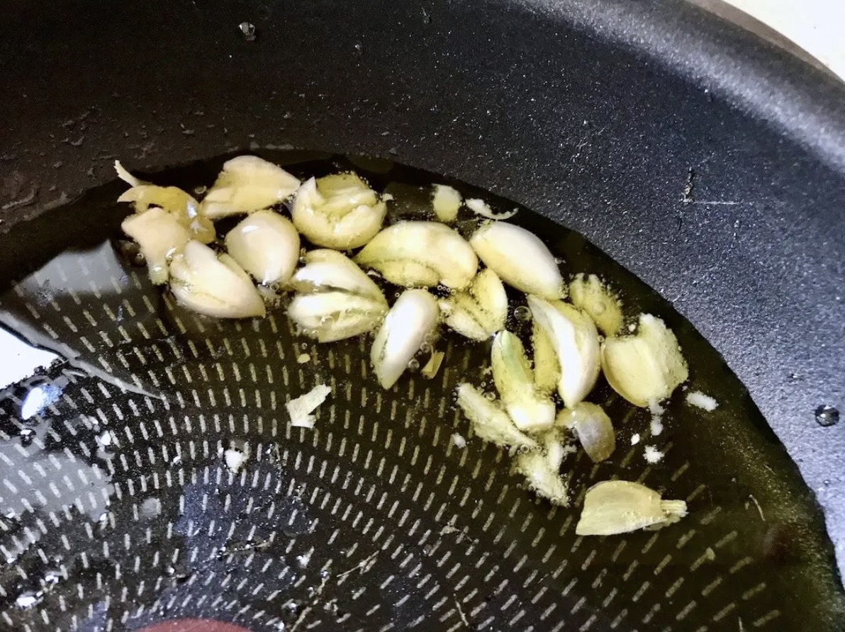 Na patelnię wlej nieco oliwy i wrzuć pokrojony czosnek. Smaż 1-2 minuty na średnim ogniu, aż lekko się zrumieni. Uważaj, aby go nie przypalić.
