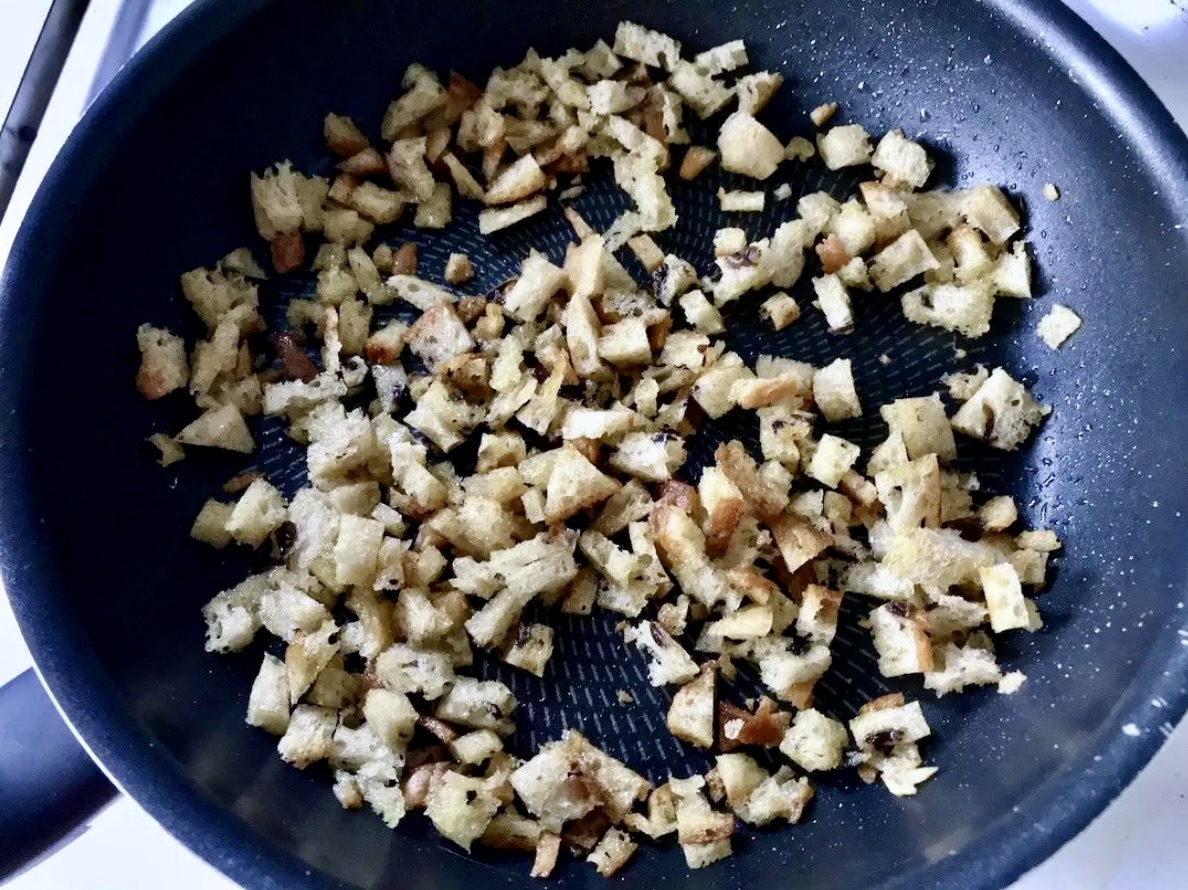 Usuń przesmażony czosnek z patelni i wrzuć na nią pokrojone pieczywo. Smaż 1-2 minuty, aż będzie chrupiące i nabierze czosnkowego aromatu.
