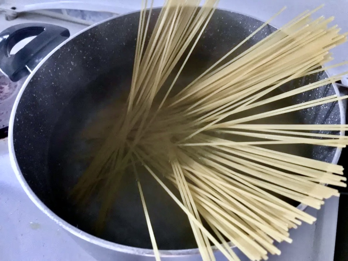 W dużym garnku ugotuj makaron spaghetti zgodnie z instrukcją na opakowaniu (poznaj przepis na makaron z cukinią szynką i figami).