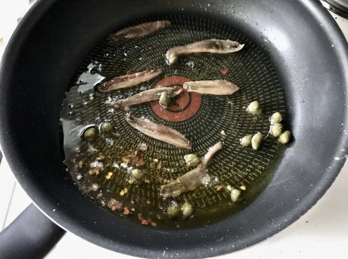 Smaż powoli na niezbyt mocnym ogniu. Fileciki anchois powinny się stopniowo rozpuszczać.
