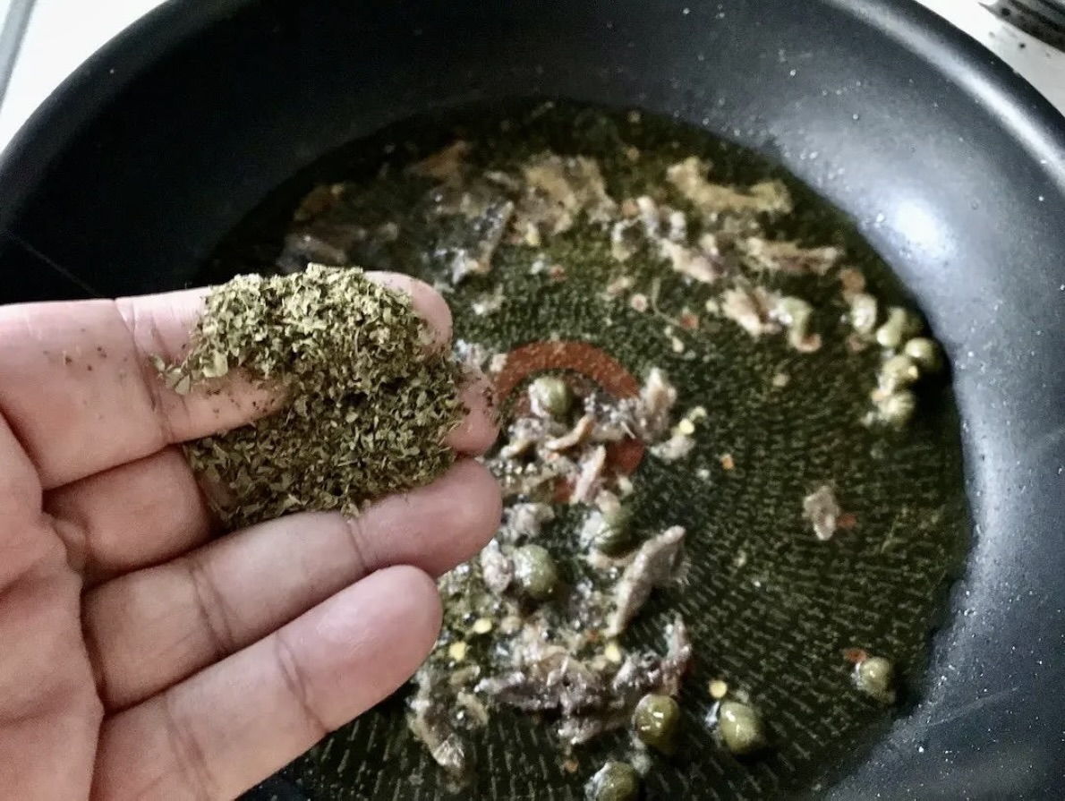 Gdy anchois się rozpuści, posyp całość suszonym oregano. Smaż krótko, ciągle mieszając, aby przyprawa się nie przypaliła.