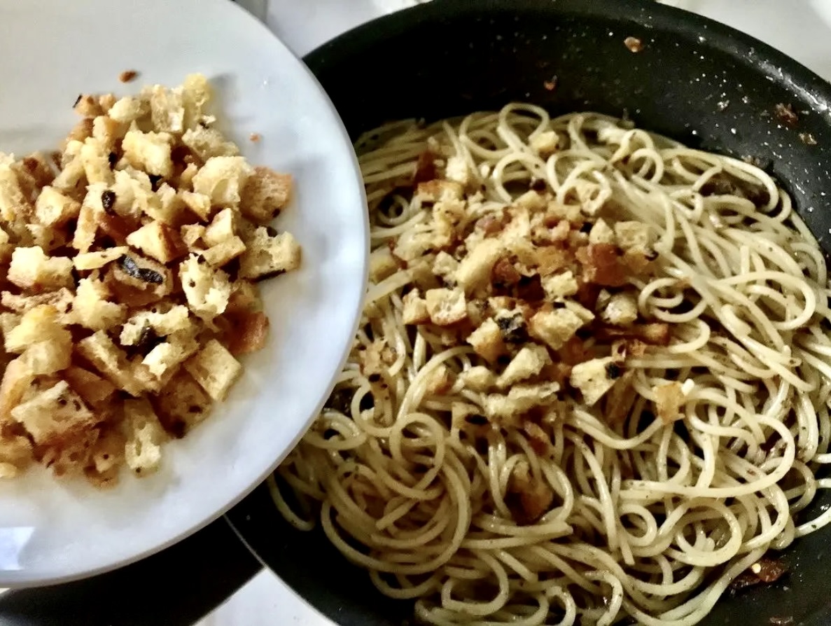 Na koniec wrzuć do makaronu na patelni większość przygotowanych wcześniej grzanek czosnkowych.