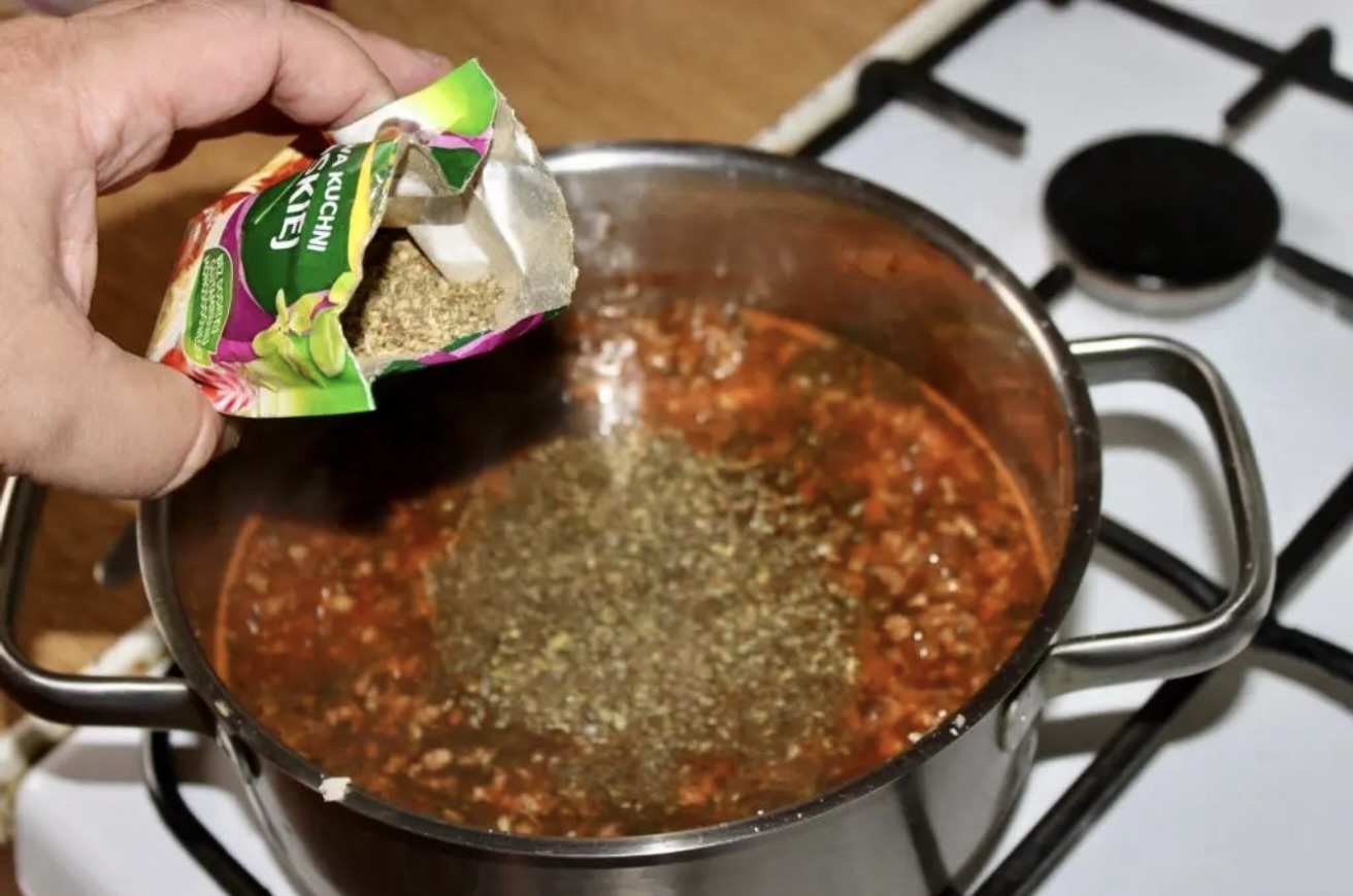 Na koniec dodaj pół opakowania gotowej „przyprawy do kuchni włoskiej”.