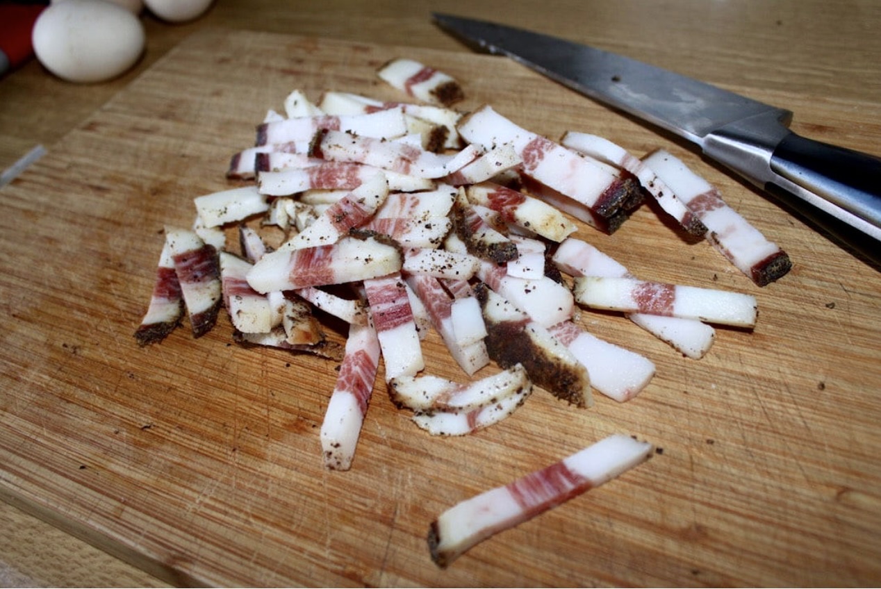 Guanciale: 150 gramów guanciale (podgardle wieprzowe), ewentualnie surowy, wędzony boczek lub pancetta.