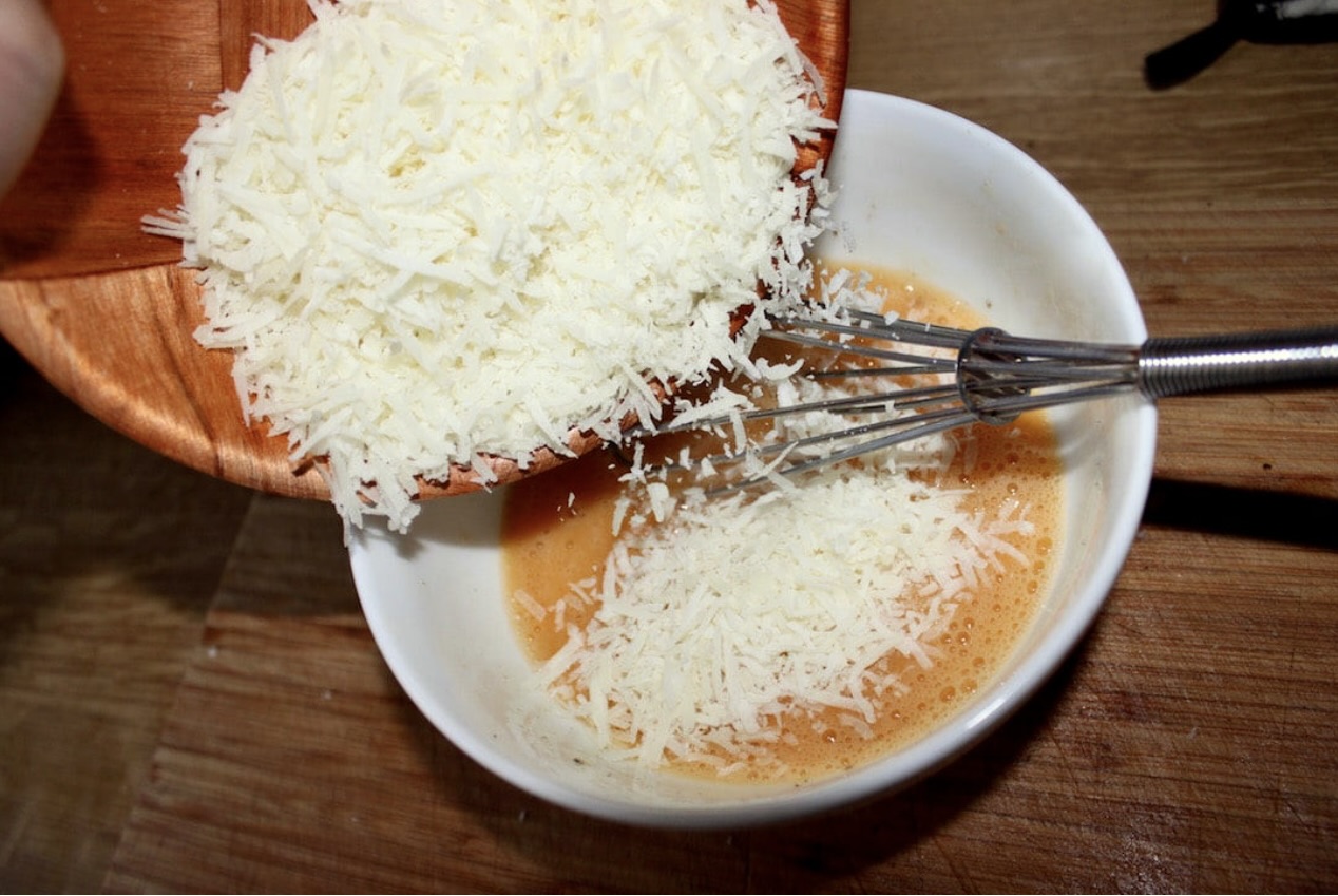 Sos: W misce rozbełtaj 2 całe jajka i 1 żółtko, a następnie obficie popieprz świeżo zmielonym pieprzem. Do masy jajowej dodaj starty ser Pecorino Romano i dobrze wymieszaj.