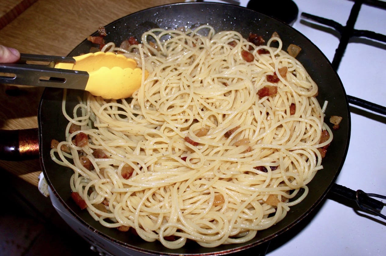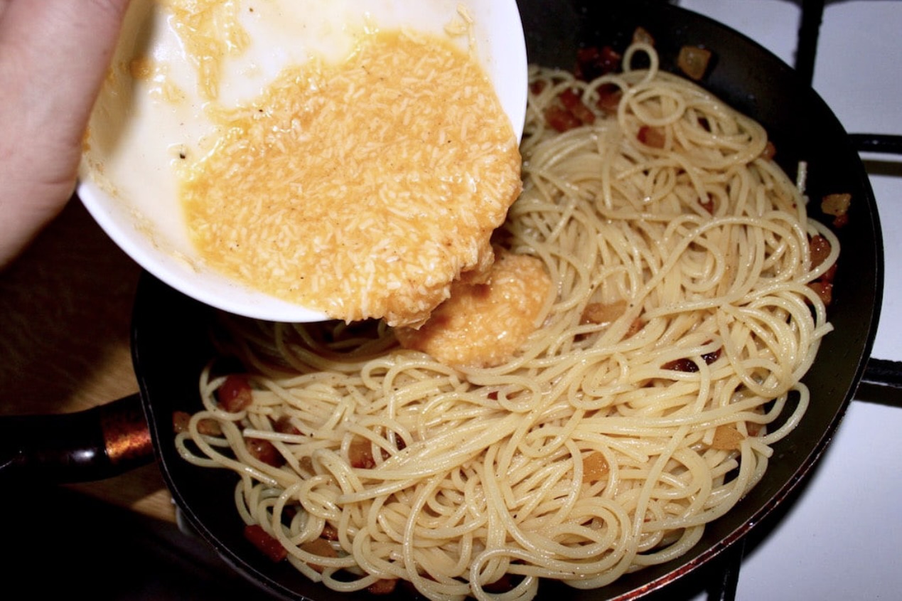 Emulsja: Wrzuć odcedzony makaron na patelnię i wymieszaj, aby oblepił się tłuszczem. Następnie wlej masę jajeczno-serową.
