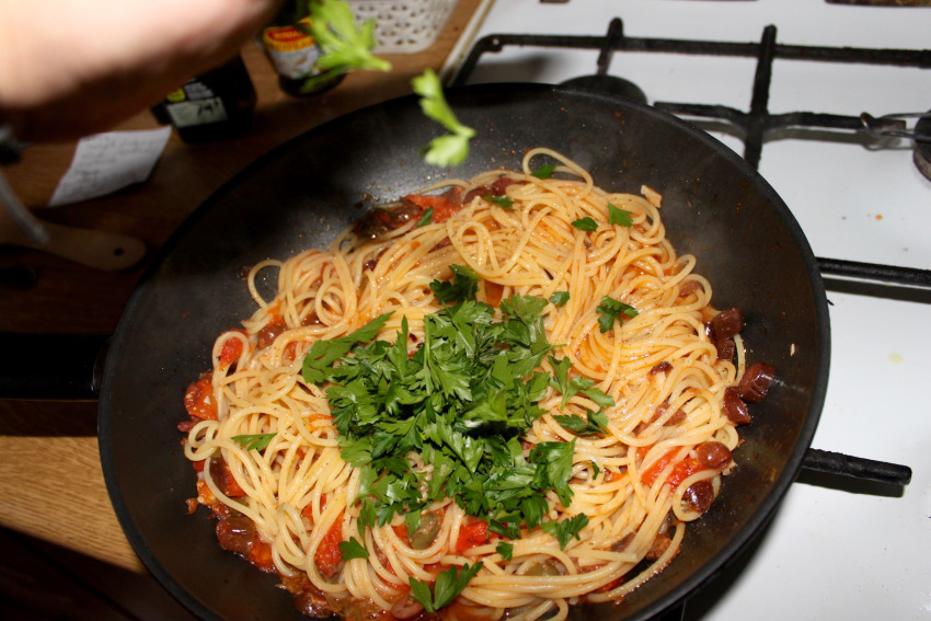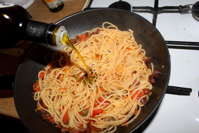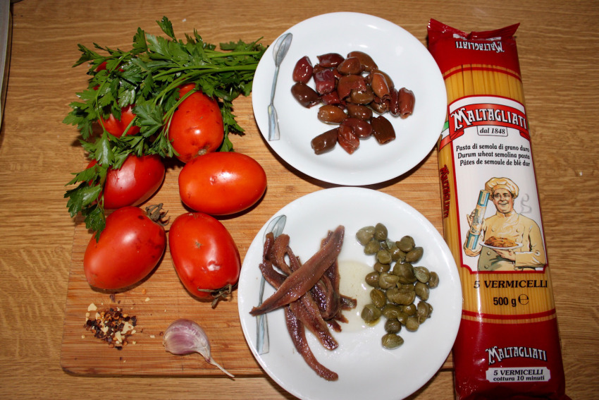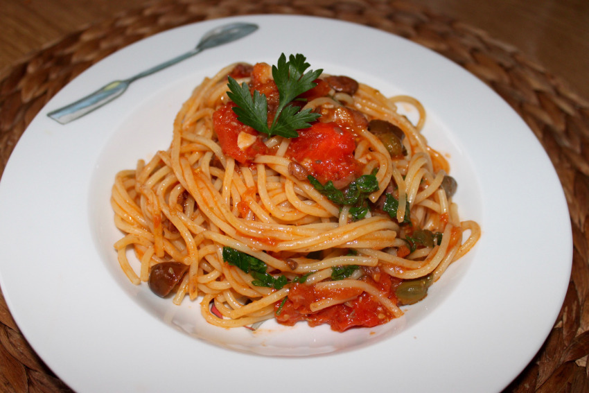 Makaron spaghetti podany z sosem alla Puttanesca przygotowanym na bazie kaparów, anchois, oliwek i pomidorów. Spaghetti alla puttanesca to danie, o którego wyjątkowości stanowi właśnie jego sos. Wspaniały, oliwny, o smaku słonych kaparów, anchois i oliwek, a także słodkich, dojrzałych na słońcu pomidorów. Ale pamiętaj, że we Włoszech sos do makaronu traktuje się jedynie jako przyprawę. Dlatego też robi się go tylko tyle, aby oblepił makaron. Nie daj się zwieźć zatem, że w tym przepisie jest być może za mało składników do przygotowania sosu. Jest go dokładnie tyle, ile powinno być. Spaghetti alla puttanesca to naprawdę pyszne danie.