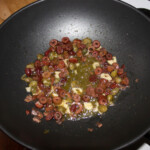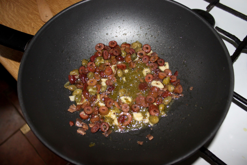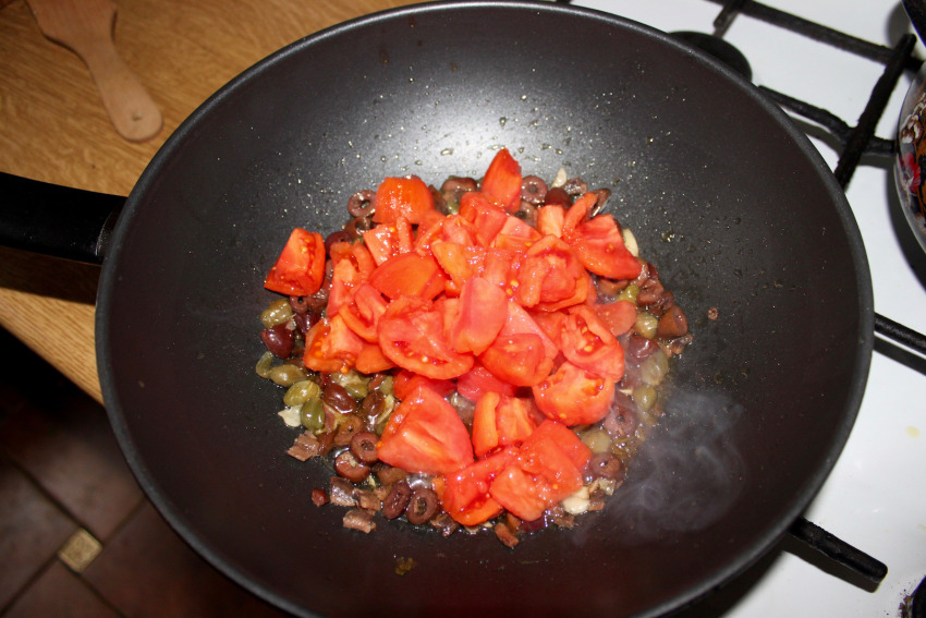 Następnie wrzuć na patelnię oliwki, kapary i anchois. Smaż na średnim ogniu kolejne 2 minuty, aż zacznie uwalniać się wspaniały aromat.