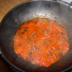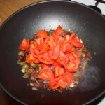 Wrzuć pokrojone pomidory i podkręć nieco gaz, aby pomidory nie spowodowały wstrzymania gotowania.
