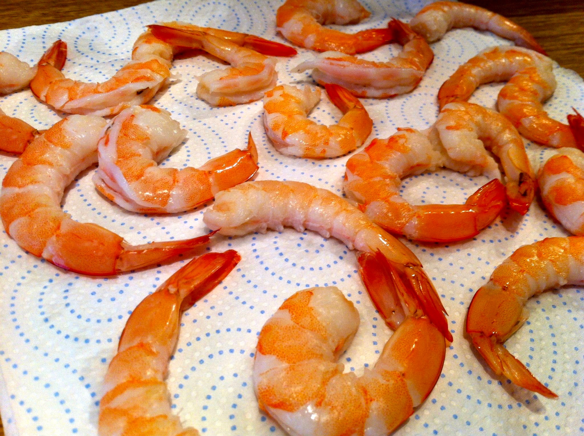 Przygotowanie krewetek: Obierz krewetki z pancerzyków i usuń przewód pokarmowy (około 20 sztuk na 2 osoby).