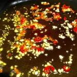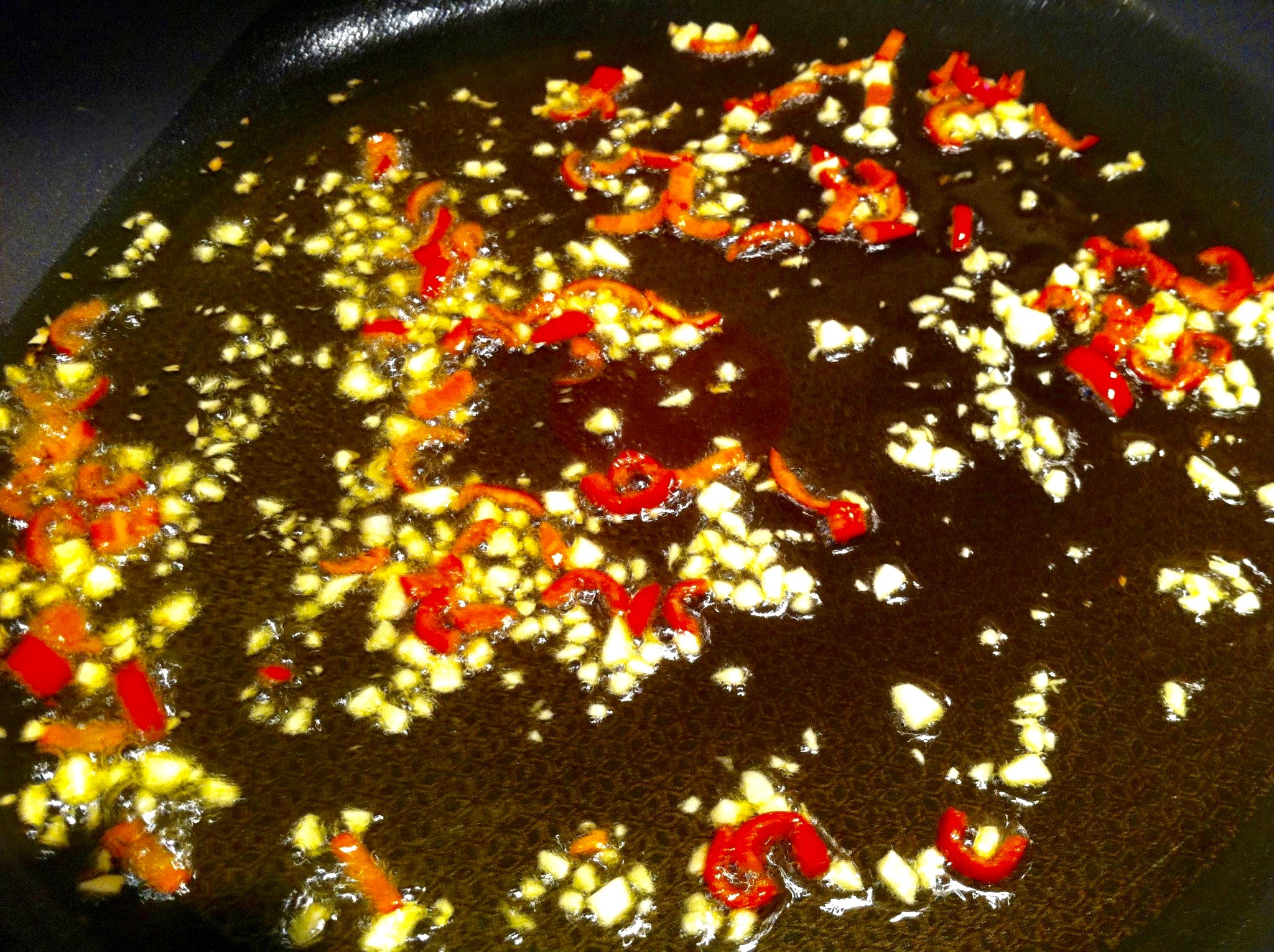 Przygotowanie aromatycznej bazy: Pokrój 2 papryczki chilli i 2 obrane ząbki czosnku. Na patelni rozgrzej sporą ilość oliwy, a następnie wrzuć czosnek i papryczkę chilli. Smaż na średnim ogniu około 1 minuty. Uważaj, aby nie przypalić czosnku, bo będzie gorzki.