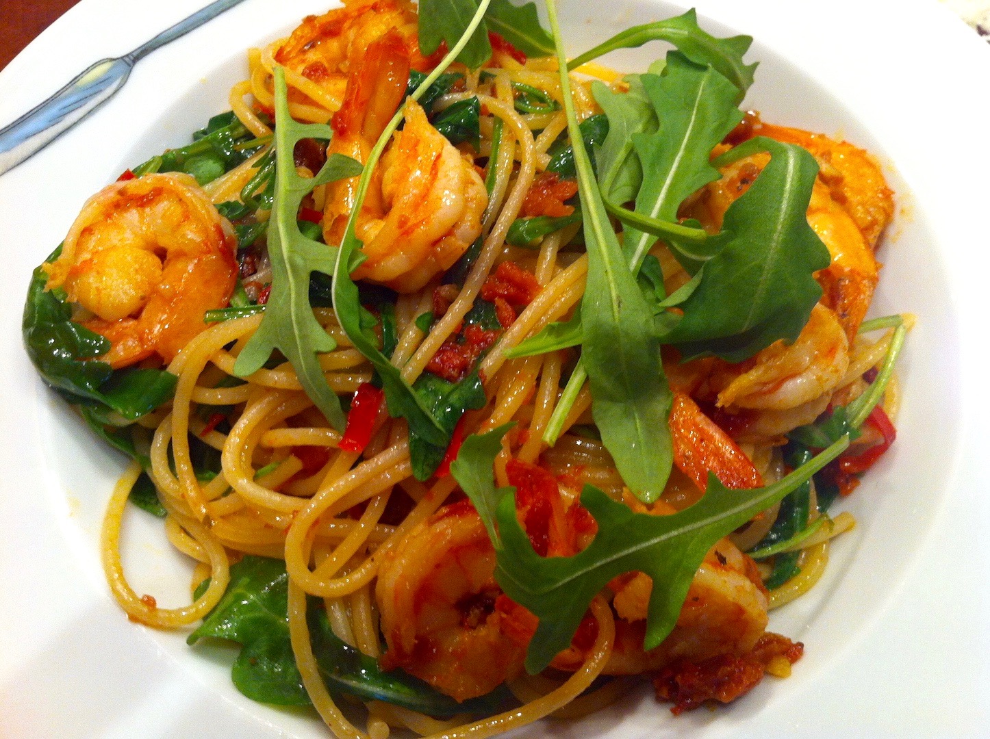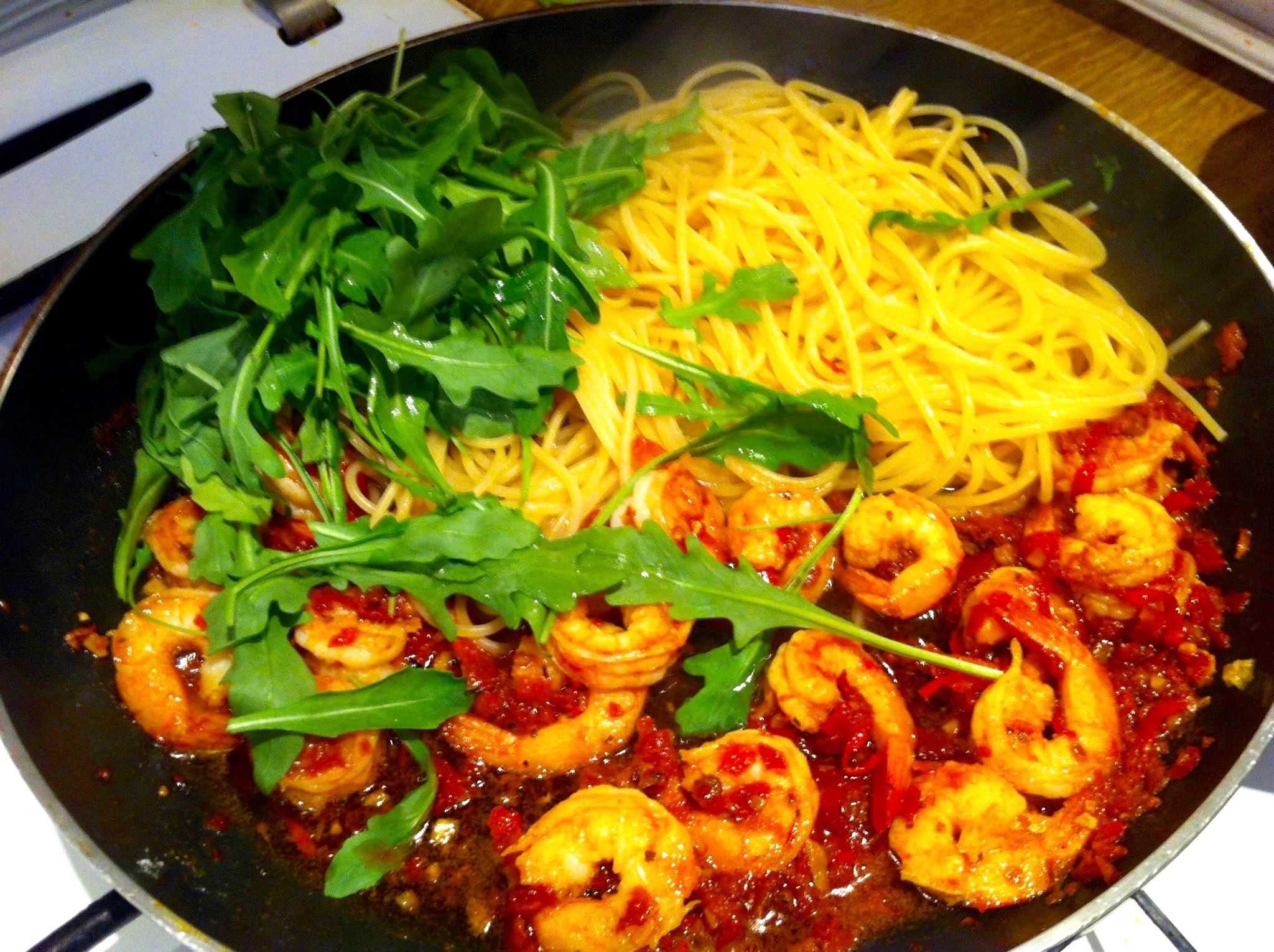 Makaron spaghetti ze smażonymi z czosnkiem i chilli krewetkami, pomidorami i świeżą rukolą. Spaghetti z krewetkami pozwoli poczuć Ci smak słonecznej Sycylii w długi, zimowy dzień albo w letnie, upalne południe. To danie można jeść cały rok, będzie smakować zawsze. Prostota kuchni włoskiej i jej smaki są powalające. To kolejne danie, do przygotowania którego potrzebujesz zaledwie 3 głównych składników, a efekt jest piorunujący. Nie wierzysz i uważasz to za pustosłowie? A zatem przygotuj to danie i zmień zdanie na ten temat na zawsze.