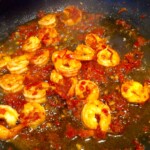 Smażenie krewetek: Następnie wrzuć na patelnię krewetki i smaż całość kolejną minutę.