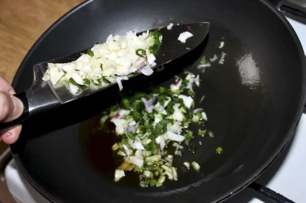 Smażenie bazy: Posiekaj drobno czosnek i dymkę. Rozgrzej oliwę na patelni, a następnie podsmaż je chwilę na małym ogniu.
