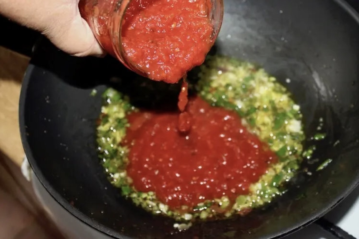 Baza sosu: 500 ml domowego przecieru pomidorowego (lub startych świeżych pomidorów).