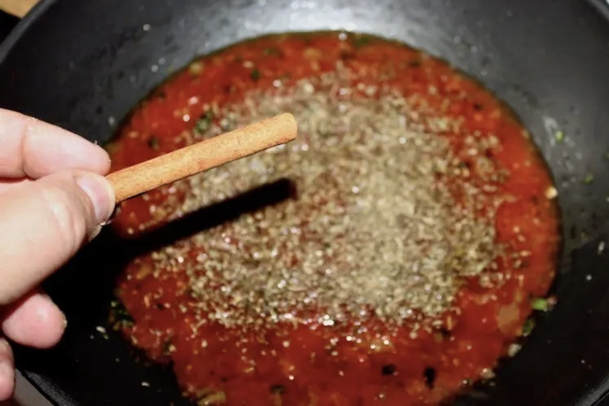 Gotowanie sosu: Wlej przecier pomidorowy. Dodaj sporą ilość oregano, tymianek, laskę cynamonu oraz liść laurowy. Dopraw solą i ewentualnie dodaj peperoncino dla ostrości.