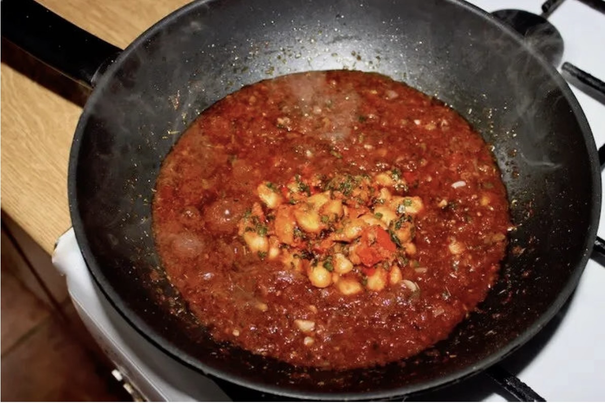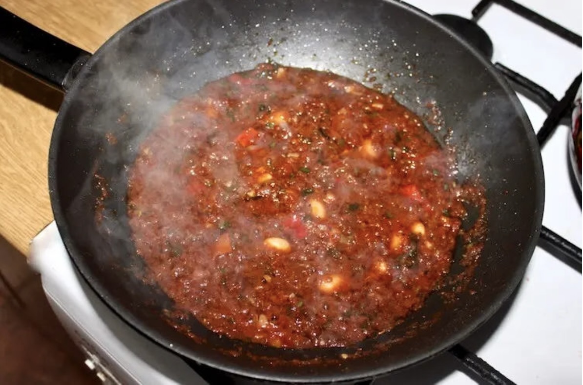 Redukcja: Duś sos na wolnym ogniu przez około 30 minut, aż woda odparuje i sos stanie się gęsty (jedynym płynem powinna być oliwa).