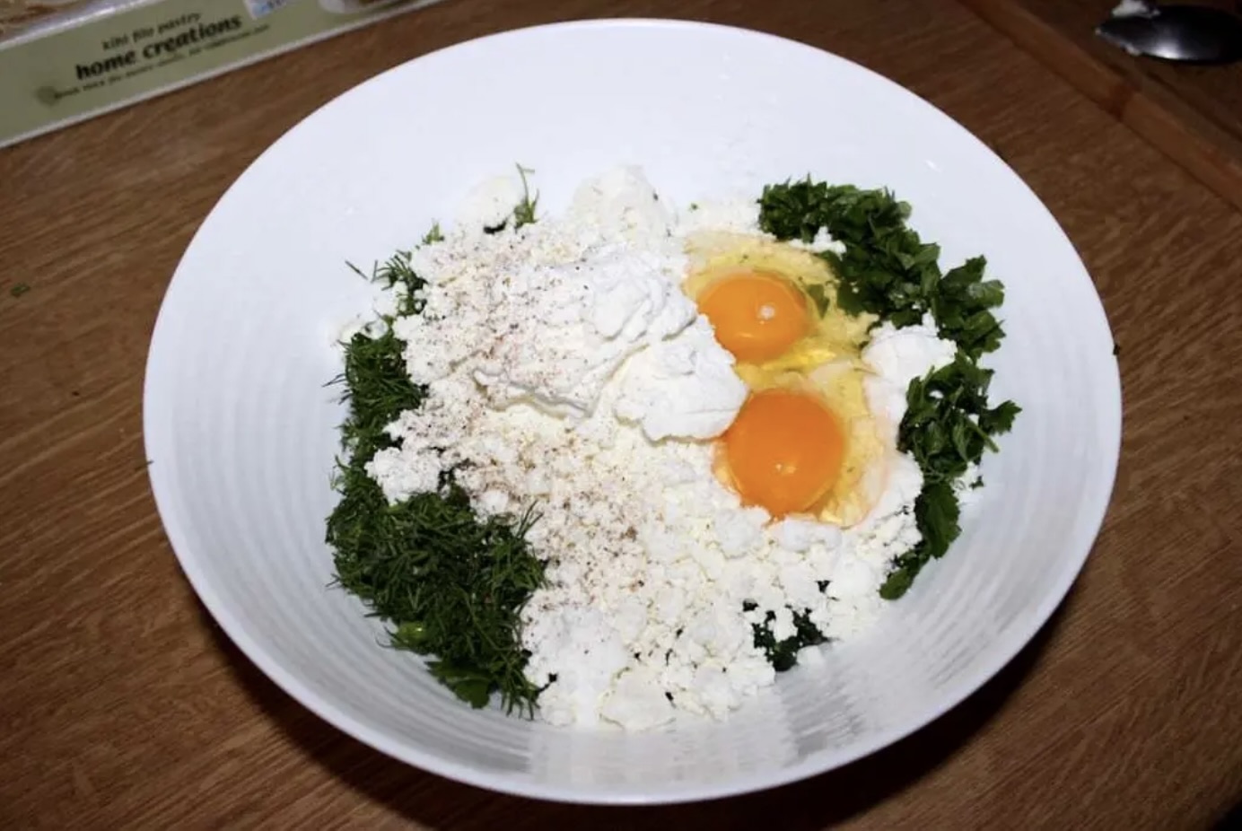 Wkrusz drobno ser feta, dodaj ricottę (jeśli używasz), 2 jajka, sól i świeżo zmielony pieprz do smaku.